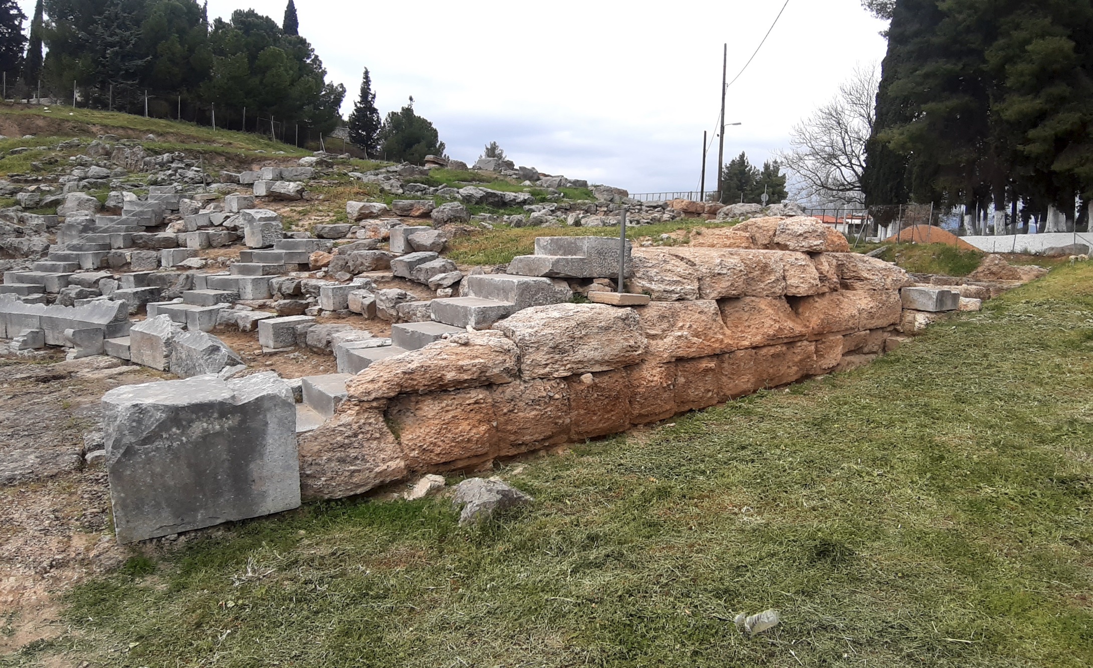 Στο τμήμα αυτό παρουσιάζεται η μορφολογία και η διάταξη των αναλημματικών τοίχων του Θεάτρου, καταγράφεται η παθολογία τους, αναπτύσσεται η επιλεχθείσα πρόταση αποκατάστασης, προσδιορίζονται τα μόνιμα, κινητά και σεισμικά φορτία που ωθούν δυσμενώς τους τοίχους και τα οποία λαμβάνονται υπ’ όψιν στην στατική μελέτη και παρουσιάζεται η στατική επίλυση που έγινε για κάθε έναν από τους τοίχους ξεχωριστά, με ανάπτυξη επιφανειακού μοντέλου με τη μέθοδο των πεπερασμένων στοιχείων, προκειμένου να τεκμηριωθεί η ευστάθεια και η ασφάλεια τους, μετά την προτεινόμενη αποκατάσταση. Επίσης, επεξηγείται η διαστασιολόγηση του οπλισμού και προσδιορίζεται η μεθοδολογία εφαρμογής του στους τεχνητούς λίθους, τόσο για την περίπτωση κατασκευής των νέων λίθων όσο και για την περίπτωση συμπλήρωσης υπαρχόντων λίθων με νέο υλικό.