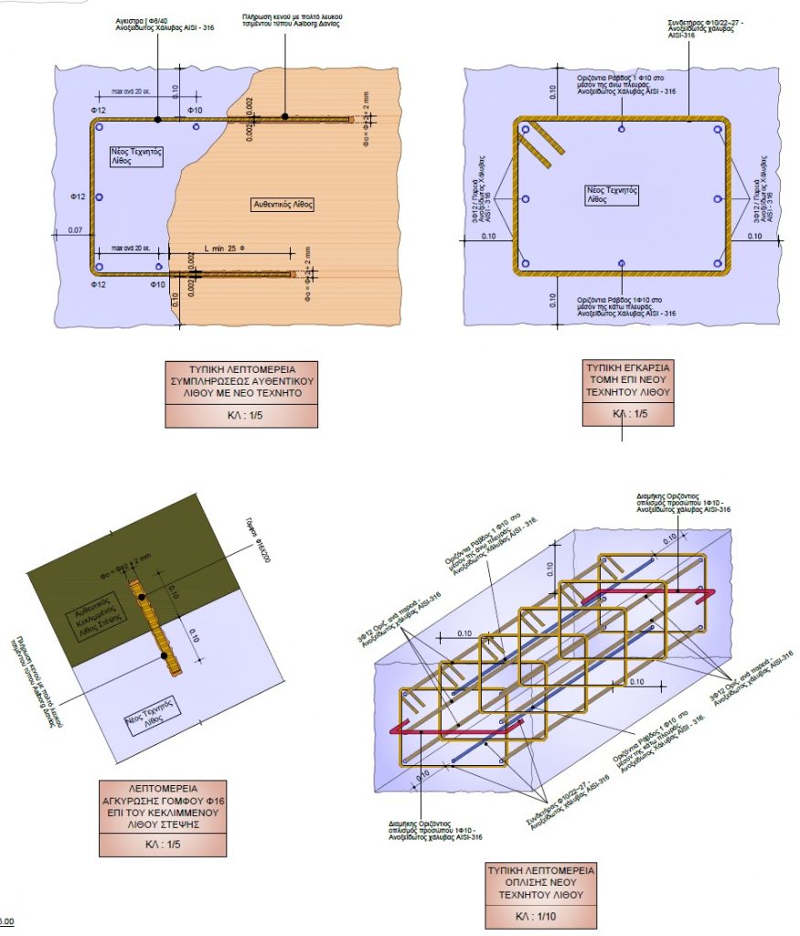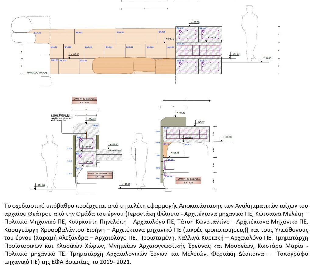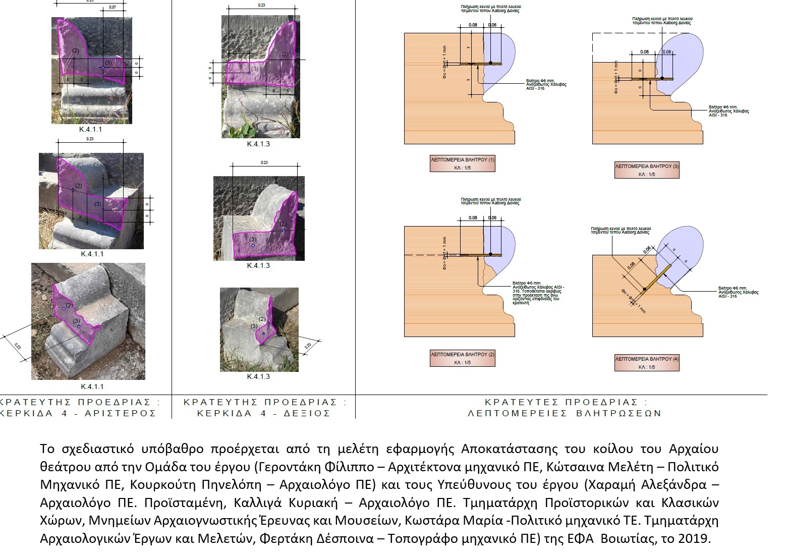 Στο τμήμα αυτό παρουσιάζoνται τα μέλη του θεάτρου που αποκαθίστανται (βαθμίδες, εδώλια, κρατευτές, ερισείνωτα), παρουσιάζεται η στατική επίλυση προκειμένου να τεκμηριωθεί η ευστάθεια και η ασφάλεια, μετά την προτεινόμενη αποκατάσταση, καθώς και παρουσιάζεται η διαστασιολόγηση του οπλισμού που απαιτείται για την σύνδεση μεταξύ υφιστάμενων και συμπληρούμενων νεών μελών, είτε για την σύνδεση νέων μελών μεταξύ τους.