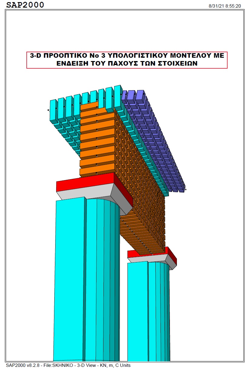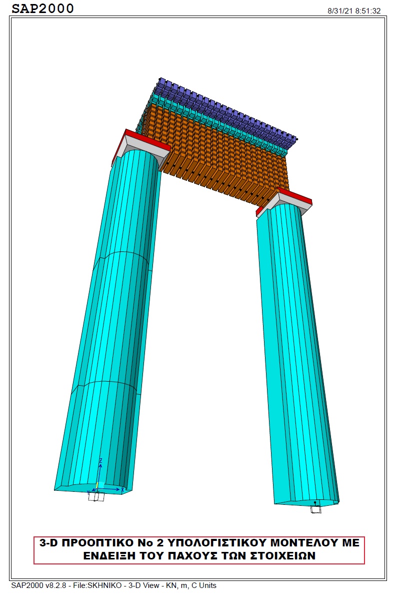 Στο τμήμα αυτό παρουσιάζεται η μορφολογία και η διάταξη των μελών του προσκήνιου, αναπτύσσεται η επιλεχθείσα πρόταση αποκατάστασης, προσδιορίζονται τα μόνιμα, κινητά και σεισμικά φορτία που δέχονται τα μέλη του προσκήνιου και τα οποία λαμβάνονται υπ’ όψιν στην στατική μελέτη, παρουσιάζεται η στατική επίλυση, η οποία έγινε με μόρφωση χωρικού μοντέλου που περιέχει τόσο γραμμικά στοιχεία (ημικίονες) όσο και πεπερασμένα επιφανειακά (θριγκός) προκειμένου να τεκμηριωθεί η ευστάθεια και η ασφάλεια, μετά την προτεινόμενη αποκατάσταση και τέλος παρουσιάζεται η διαστασιολόγηση του οπλισμού που απαιτείται τόσο για την σύνδεση μεταξύ υφιστάμενων και νεών μελών όσο και για την σύνδεση υφιστάμενων μελών μεταξύ τους.