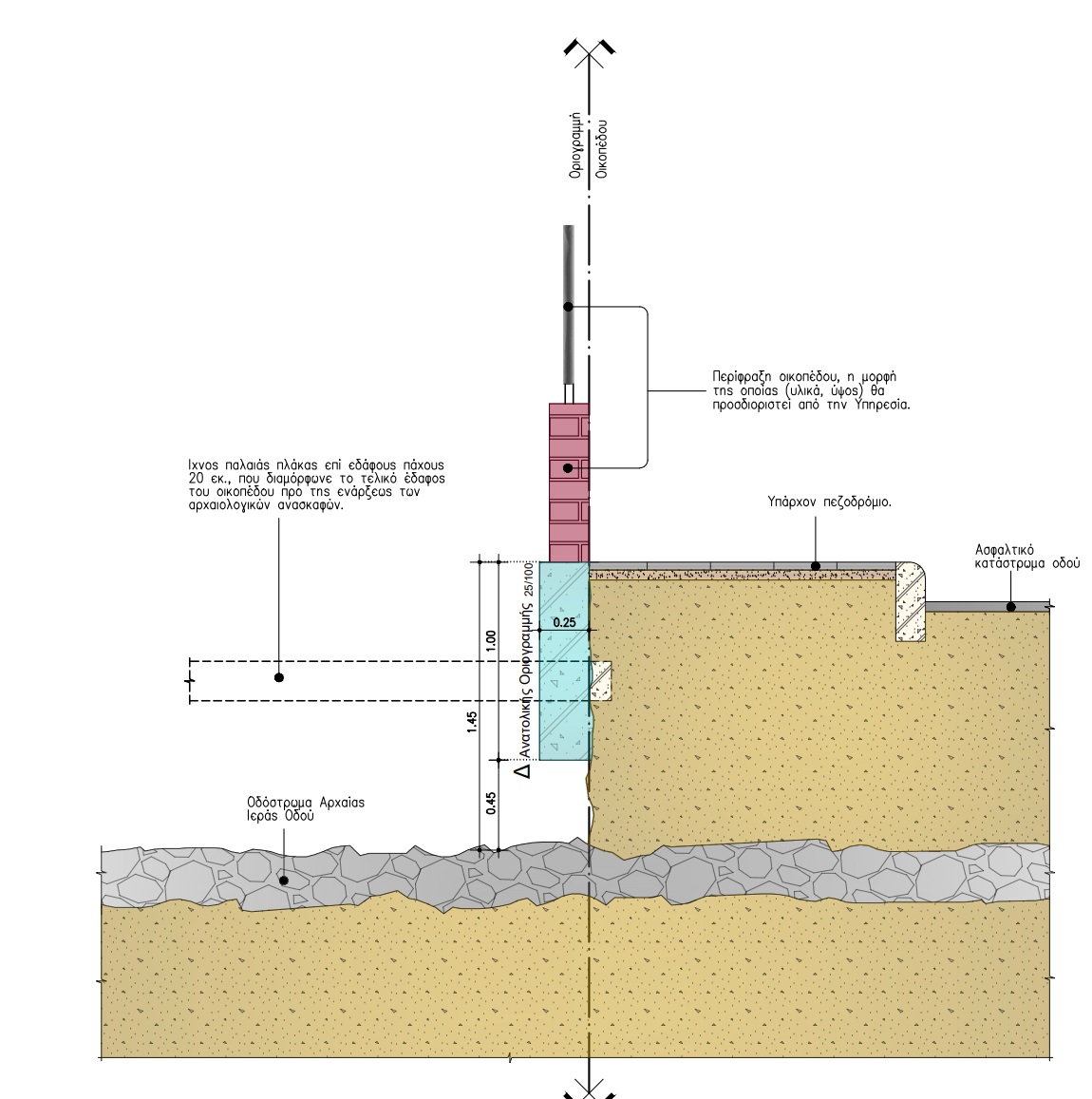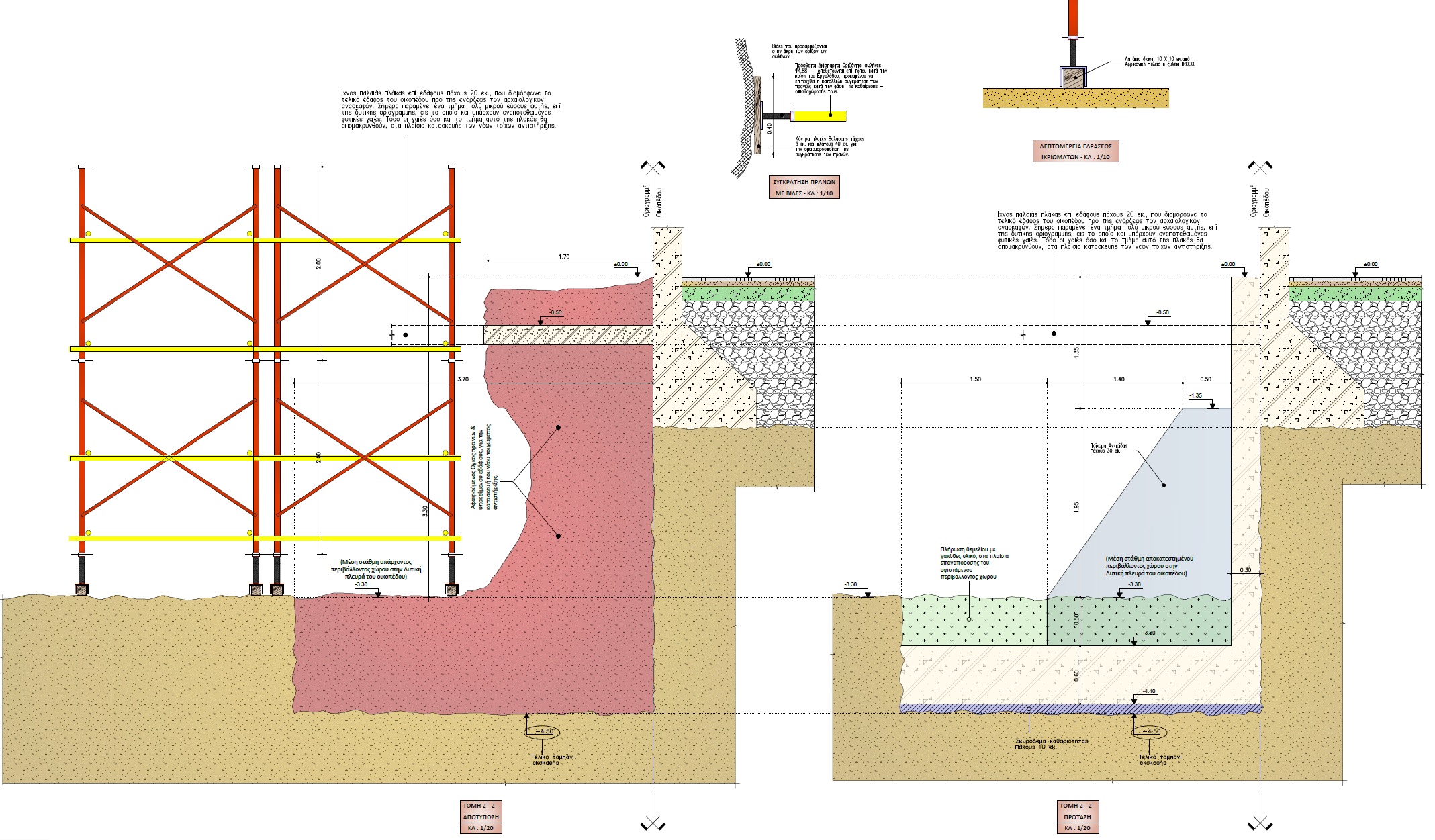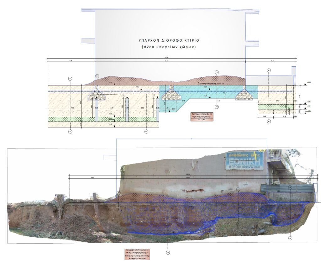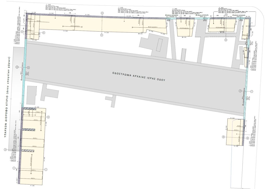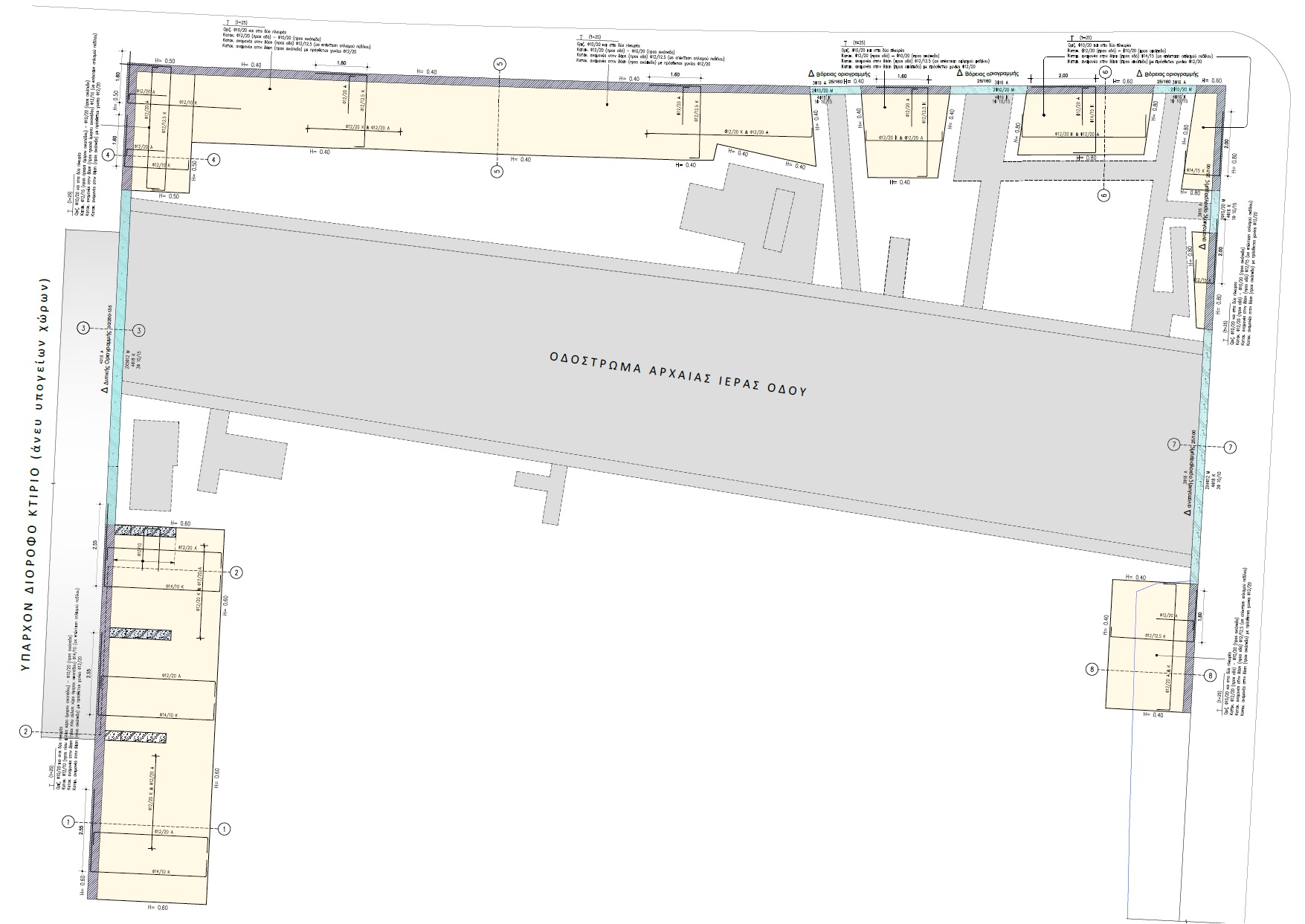 Σε οικόπεδο φερομένης ιδιοκτησίας ΕΦΚΑ στην Ελευσίνα, μετά από ανασκαφικές εργασίες της δεκαετίας ’70, αποκαλύφθηκε τμήμα της Ιεράς Οδού καθώς και διάσπαρτες Αρχαιότητες. Με την συγκεκριμένη μελέτη στατικής επάρκειας και αντιστήριξης πρανών, καταγράφεται η παθολογία των πρανών της τότε εκσκαφής ανά πλευρά του οικοπέδου, αναπτύσσεται η εκάστοτε επιλεχθείσα πρόταση αντιστήριξης μετά των προϋποθέσεων εφαρμογής της και επιλύεται – διαστασιολογείται η επιλεγμένη πρόταση αντιστήριξης. Συγκεκριμένος τοίχος αντιστήριξης μεγάλου ύψους, λόγω των εγκάρσιων αντιρίδων που φέρει, επιλύεται και διαστασιολογείται με την μέθοδο των πεπερασμένων στοιχείων. Επί των αρχαιοτήτων και πέριξ αυτών, αποφεύγεται οιαδήποτε μορφή θεμελίωσης.