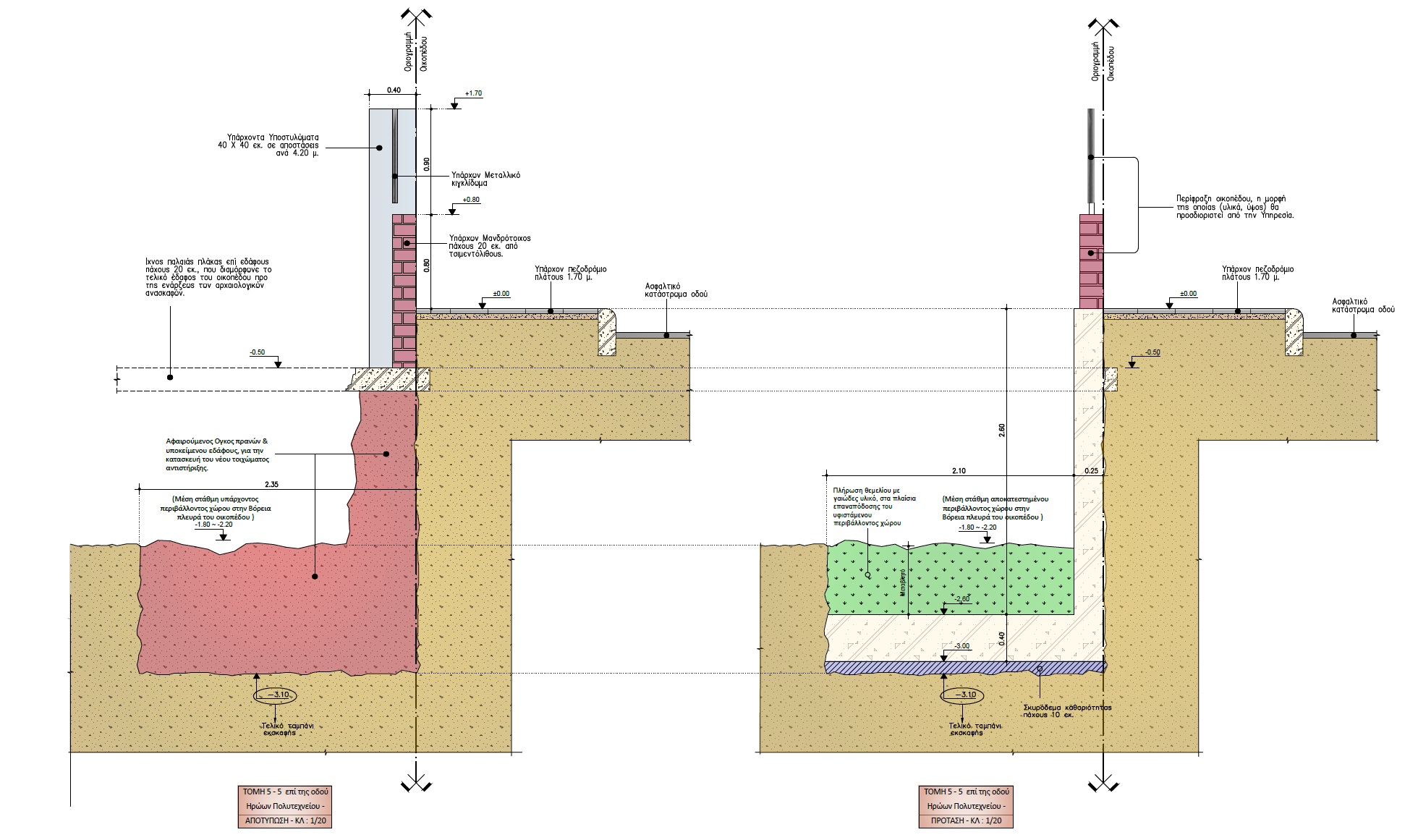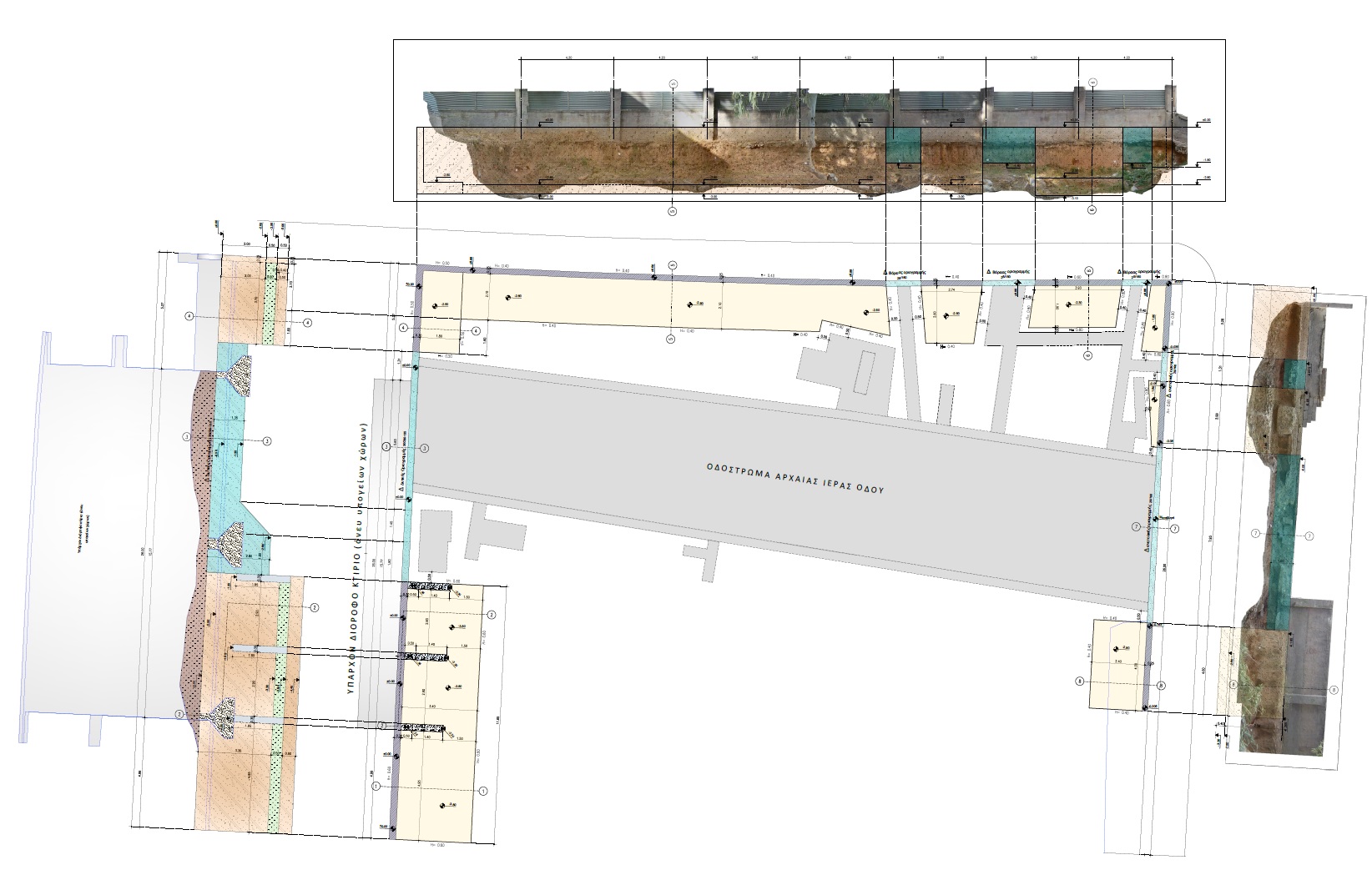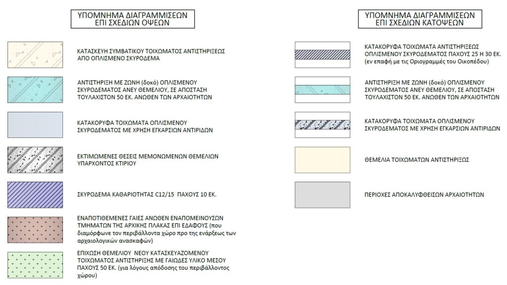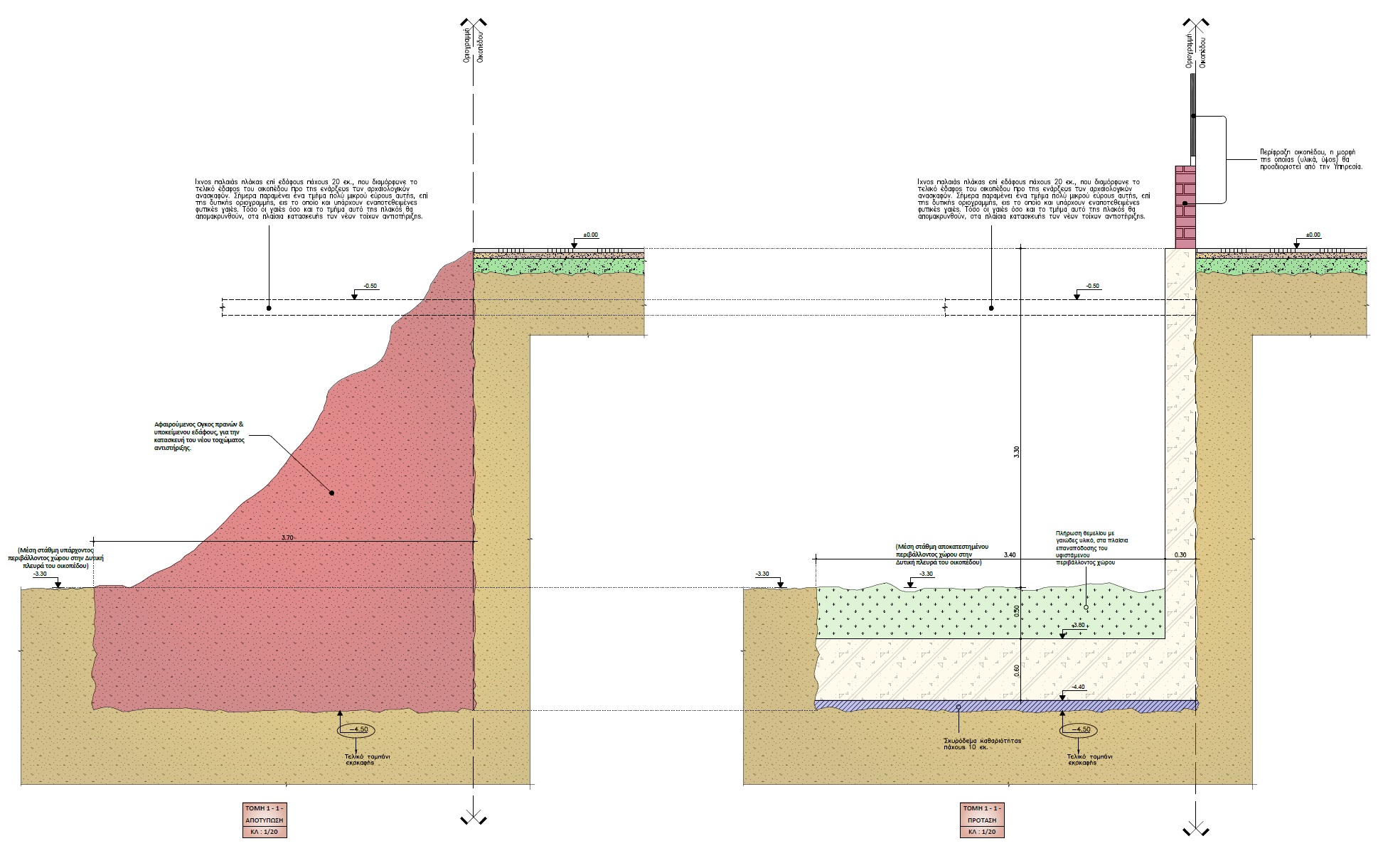 Σε οικόπεδο φερομένης ιδιοκτησίας ΕΦΚΑ στην Ελευσίνα, μετά από ανασκαφικές εργασίες της δεκαετίας ’70, αποκαλύφθηκε τμήμα της Ιεράς Οδού καθώς και διάσπαρτες Αρχαιότητες. Με την συγκεκριμένη μελέτη στατικής επάρκειας και αντιστήριξης πρανών, καταγράφεται η παθολογία των πρανών της τότε εκσκαφής ανά πλευρά του οικοπέδου, αναπτύσσεται η εκάστοτε επιλεχθείσα πρόταση αντιστήριξης μετά των προϋποθέσεων εφαρμογής της και επιλύεται – διαστασιολογείται η επιλεγμένη πρόταση αντιστήριξης. Συγκεκριμένος τοίχος αντιστήριξης μεγάλου ύψους, λόγω των εγκάρσιων αντιρίδων που φέρει, επιλύεται και διαστασιολογείται με την μέθοδο των πεπερασμένων στοιχείων. Επί των αρχαιοτήτων και πέριξ αυτών, αποφεύγεται οιαδήποτε μορφή θεμελίωσης.