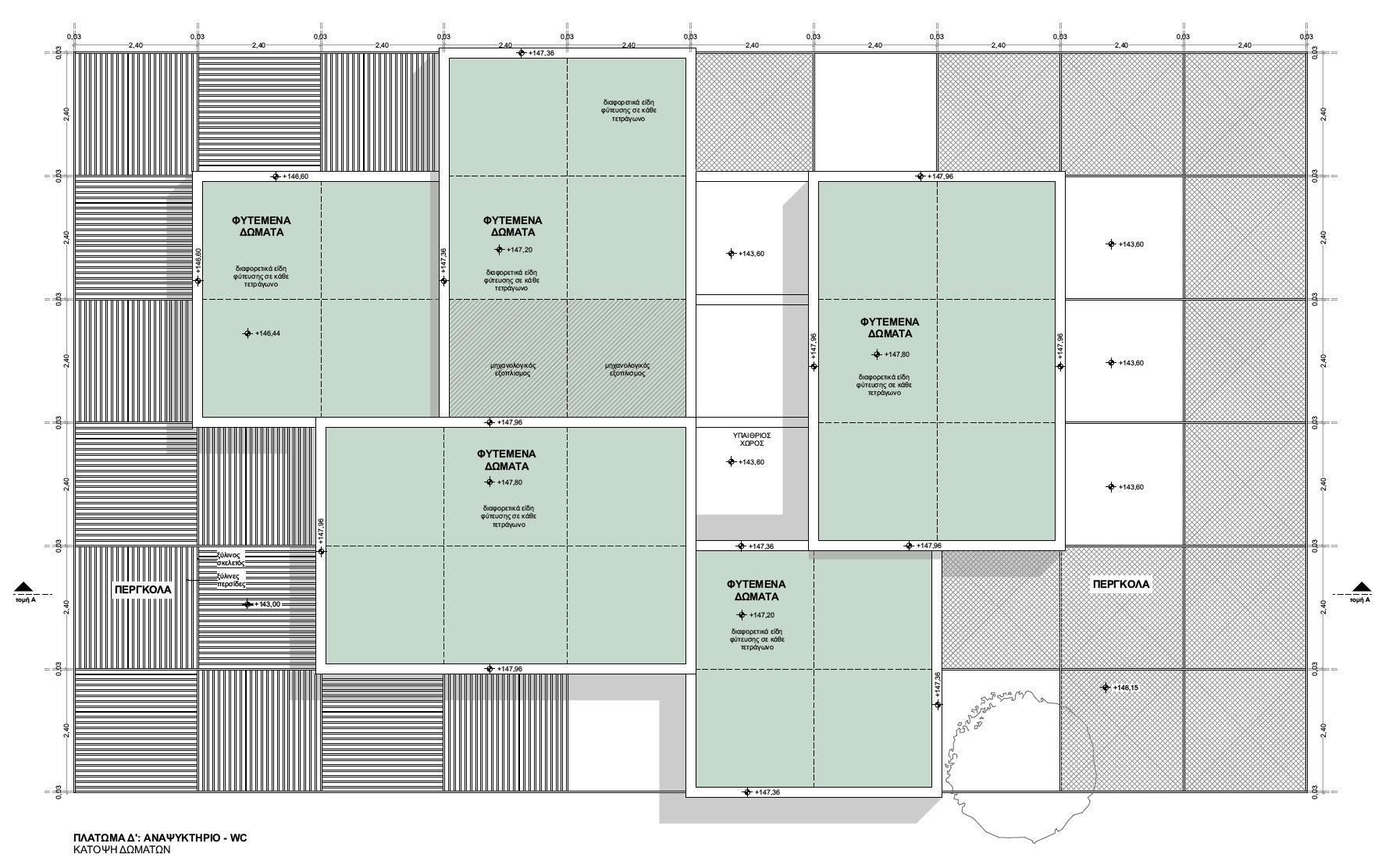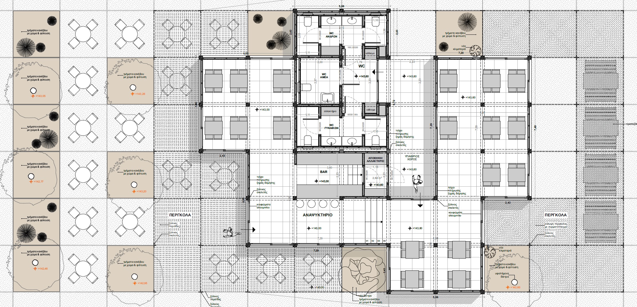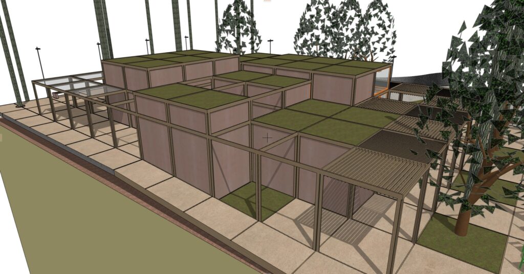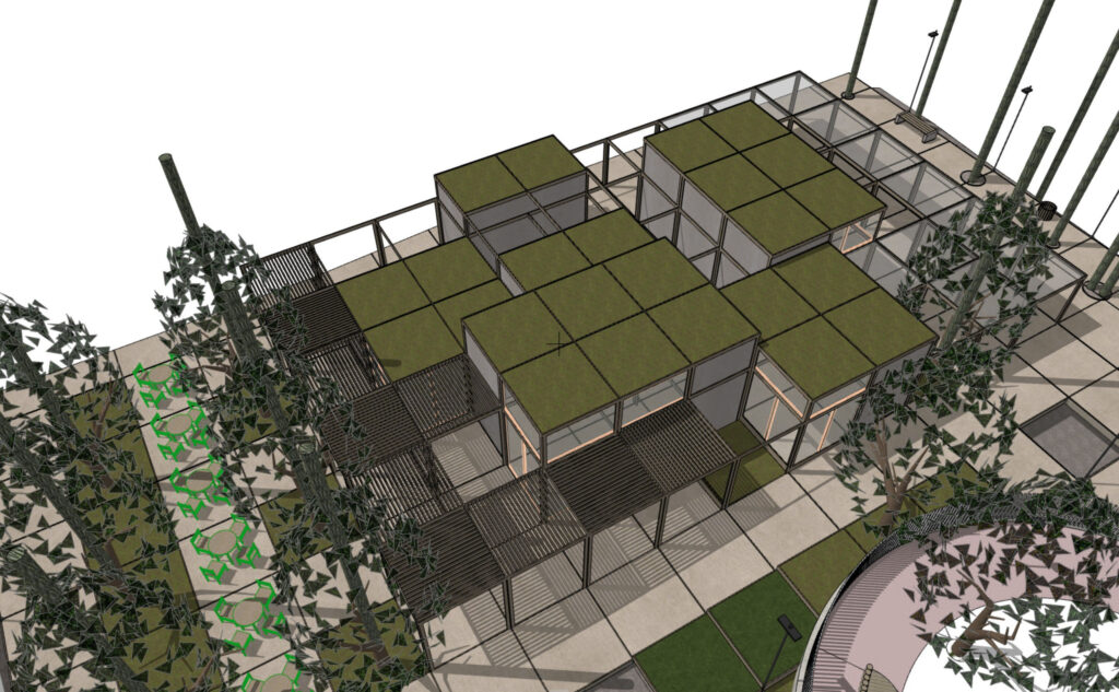 Η μελέτη αφορά τον προσδιορισμό των ξύλινων διατομών Ισόγειων κλειστών χώρων, τα οποία προορίζονται για Δημόσια Χρήση (εστίαση, εκθέσεις κτλ.) και πρόκειται να κατασκευαστούν στην κορυφή του «Λόφου του Παιδιού», στο Γαλάτσι. Η ξύλινη πέργκολα που διατάσσεται πέριξ των κλειστών χώρων, επίσης αποτελεί αντικείμενο της μελέτης. Στις διατομές που μορφώνουν τους κλειστούς χώρους, ελήφθησαν υπ’ όψιν οι ελάχιστες διατομές για λόγους πυρασφαλείας. Οι σεισμικές δυνάμεις παραλαμβάνονται από επιλεγμένους χιαστί συνδέσμους ξυλείας, οι οποίοι τοποθετούνται σε τοίχους που δεν διαθέτουν ανοίγματα.