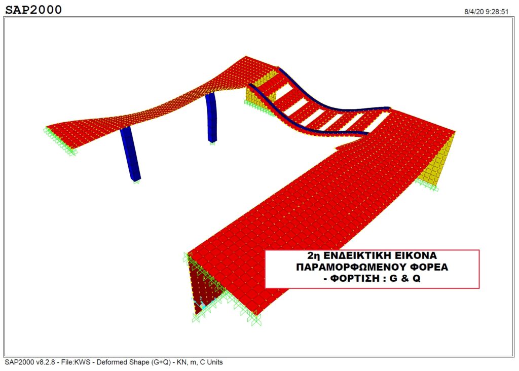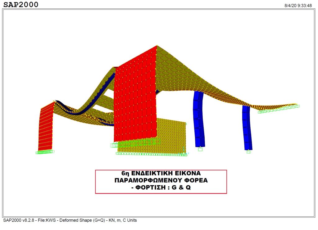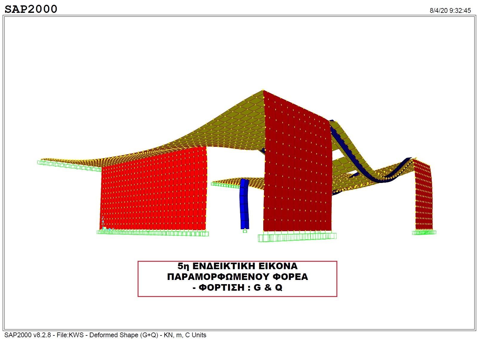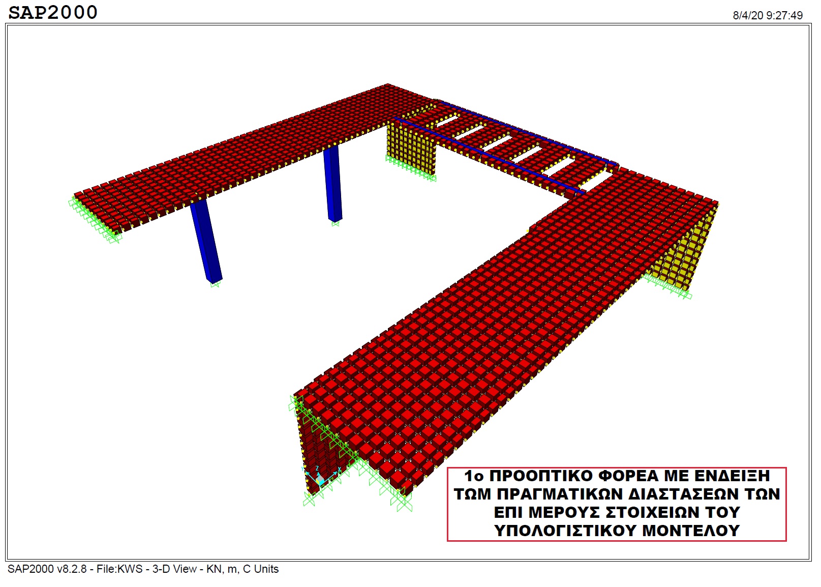 Για την πέργκολα με τις πλάκες – σκέπαστρα που προβλέπεται να κατασκευαστεί στην δεξιά πλευρά του Ισογείου, έγινε επιπρόσθετη ακριβέστερη μελέτη, προκειμένου να διερευνηθεί πλήρως ο ακριβής τρόπος κατανομής των εντατικών μεγεθών. Ετσι, ο τοπικός φορέας αναπαραστάθηκε και επιλύθηκε με την μέθοδο των γραμμικών και επιφανειακών πεπερασμένων στοιχείων (shell elements) – χρησιμοποιήθηκε δε το πανεπιστημιακό πρόγραμμα SAP2000. Για τον περιορισμό του βέλους των δύο κύριων ενισχυμένων ζωνών της πέργκολας (του τμήματος της ζώνης – πλάκας που φέρει τις οπές)  ενσωματώνονται εντός αυτών και δύο μεταλλικές δοκοί. Η ανάλυση έδειξε ότι με την προσθήκη των δύο αυτών δοκών, εξαλείφεται στην πράξη το αναμενόμενο βέλος.