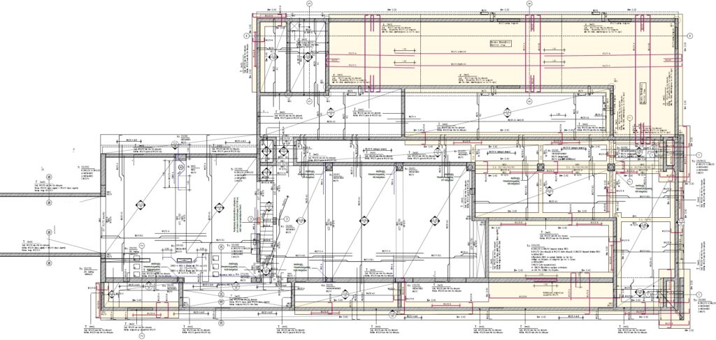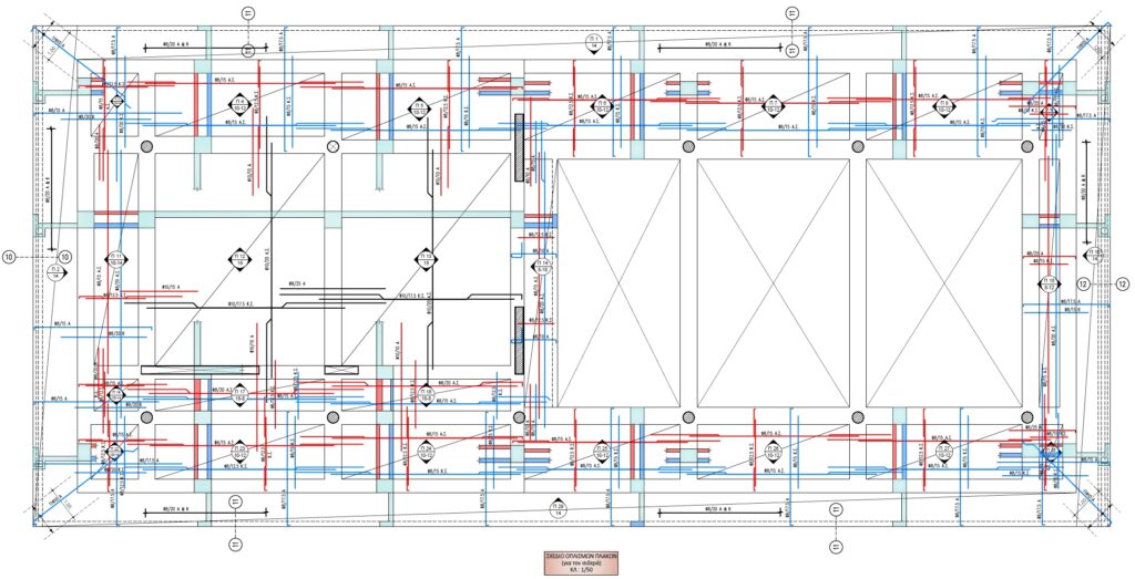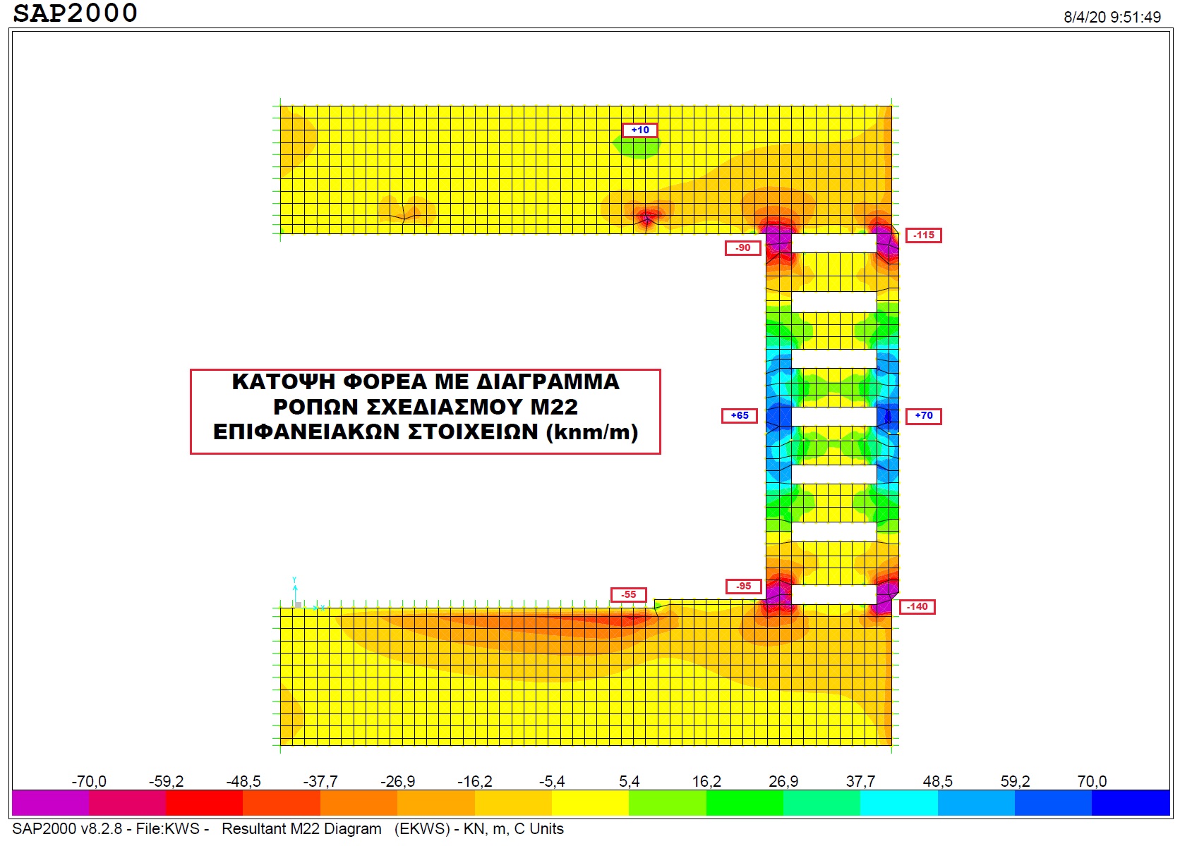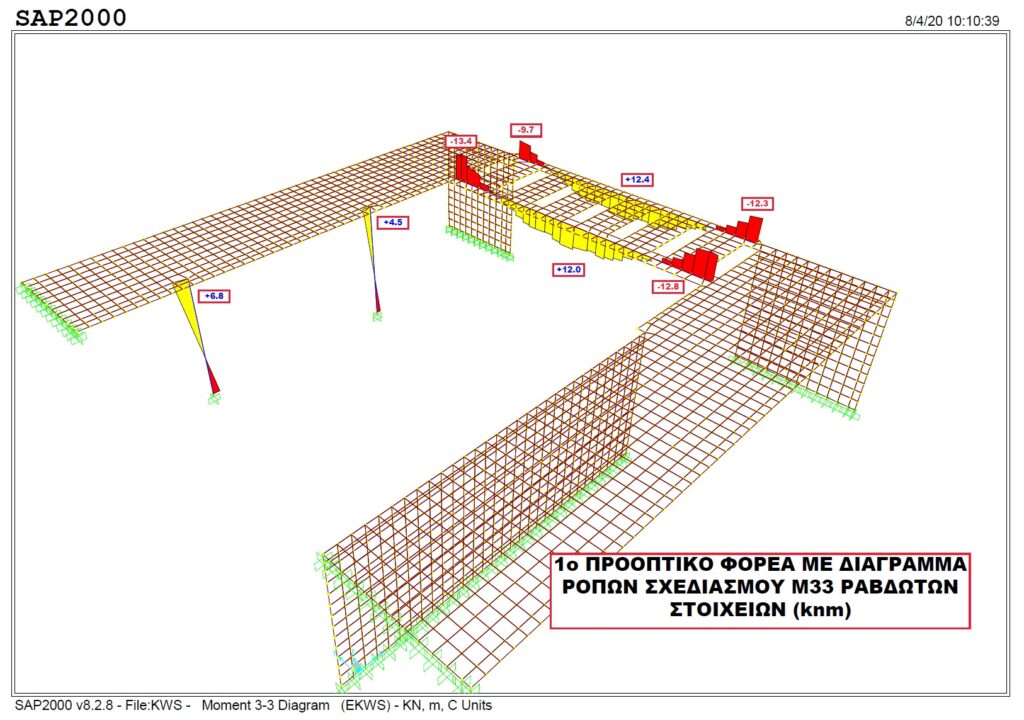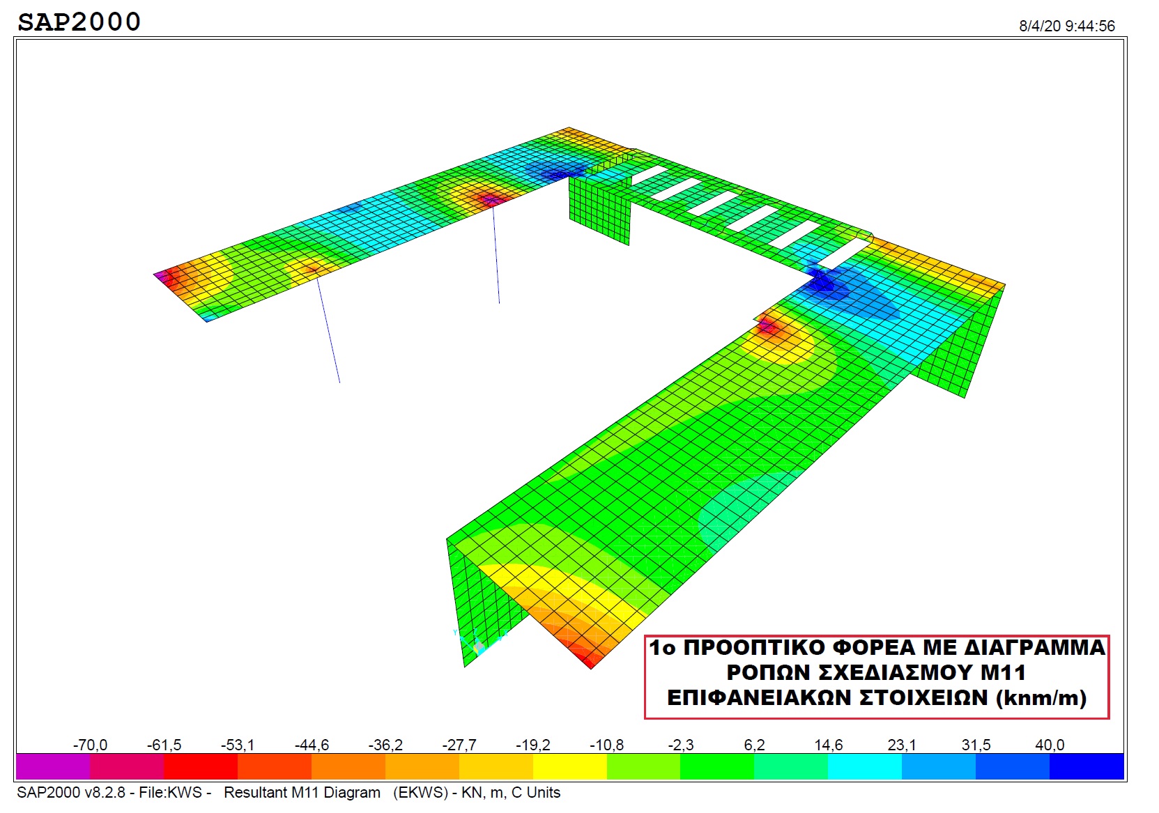 Για την πέργκολα με τις πλάκες – σκέπαστρα που προβλέπεται να κατασκευαστεί στην δεξιά πλευρά του Ισογείου, έγινε επιπρόσθετη ακριβέστερη μελέτη, προκειμένου να διερευνηθεί πλήρως ο ακριβής τρόπος κατανομής των εντατικών μεγεθών. Ετσι, ο τοπικός φορέας αναπαραστάθηκε και επιλύθηκε με την μέθοδο των γραμμικών και επιφανειακών πεπερασμένων στοιχείων (shell elements) – χρησιμοποιήθηκε δε το πανεπιστημιακό πρόγραμμα SAP2000. Για τον περιορισμό του βέλους των δύο κύριων ενισχυμένων ζωνών της πέργκολας (του τμήματος της ζώνης – πλάκας που φέρει τις οπές)  ενσωματώνονται εντός αυτών και δύο μεταλλικές δοκοί. Η ανάλυση έδειξε ότι με την προσθήκη των δύο αυτών δοκών, εξαλείφεται στην πράξη το αναμενόμενο βέλος.
