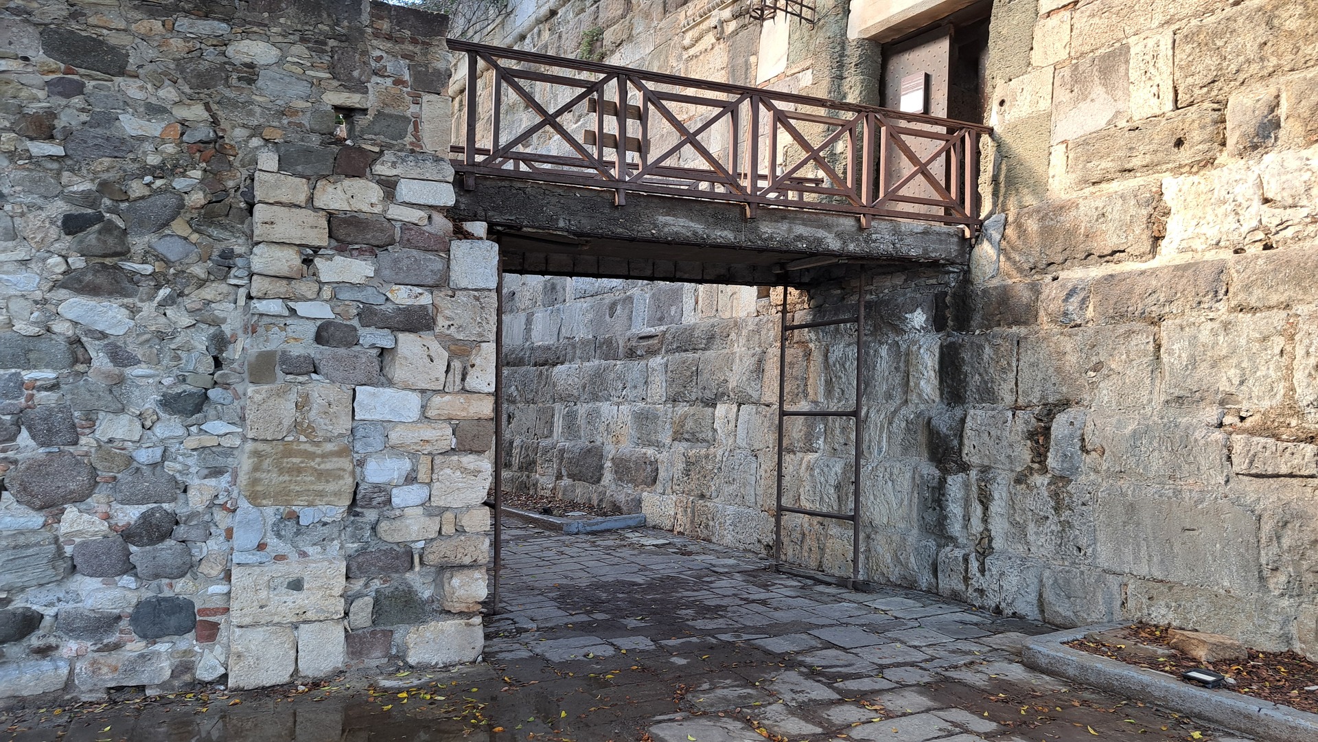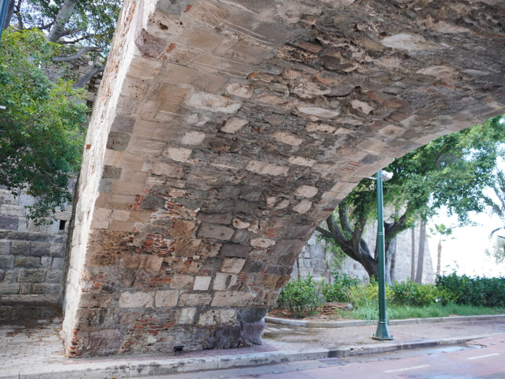 Το λίθινο μεσόβαθρο, δεν είναι δομημένο με ισόδομη ή έστω ψευδοισόδομη λιθοδομή (πλην της περιοχής που στηρίζεται η πλάκα σκυροδέματος) και οι λίθοι είναι στην πλειοψηφία τους ακανόνιστοι. Τα δύο στηθαία που φέρει απολήγουν σε ενιαία στάθμη και συγκεκριμένα στην στάθμη +14.23. Τόσο στη δυτική όψη του όσο και ιδιαίτερα στην ανατολική, διακρίνονται ίχνη από εγκάρσιους τοίχους και τοξωτό τμήμα, που πιθανά δηλώνουν ύπαρξη πρόσθετου ανοίγματος το οποίο όμως κλείστηκε κάποια στιγμή για άγνωστο λόγο. Ενδεχομένως το μεσόβαθρο να εξυπηρετούσε αρχικά την ανάγκη γεφύρωσης με το Κάστρο, δεδομένου ότι στην εξωτερική παρειά της βάσης των μεγάλων τοίχων περιτοίχισης του Κάστρου εκτιμάται ότι υπήρχε τάφρος. Εντός των εσωτερικών τμημάτων που σχηματίζονται μεταξύ των περιμετρικών και των εγκάρσιων τοίχων, έχει υπάρξει πλήρωση με υλικό, το οποίο και φέρει μικρούς ακανόνιστους λίθους, όπως τουλάχιστον αυτοί καθίστανται ορατοί μέσω οπτικής παρατήρησης από την εσωτερική απόληξη των τεσσάρων σκαλότρυπων που υπάρχουν στην δυτική πλευρά του οικοδομήματος.
