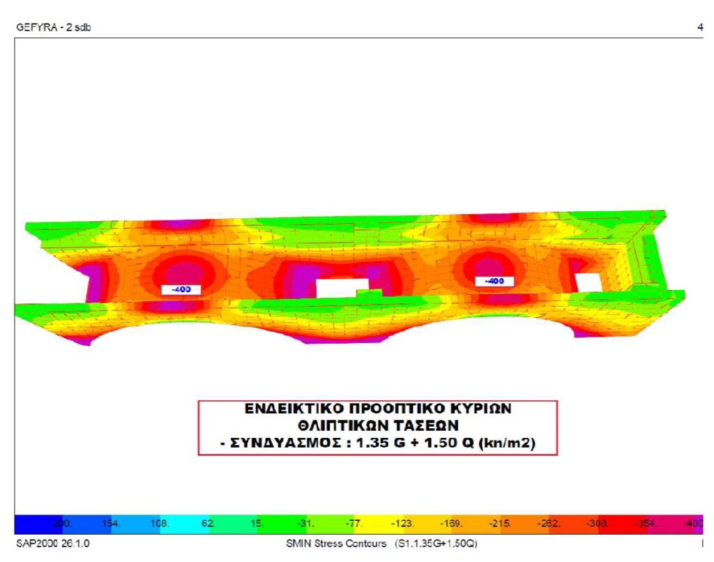 Λόγω της εγγύτητας στην θάλασσα, των καιρικών συνθηκών, αλλά πιθανά και από (προβληματική) σύνθεση σκυροδέματος (πιθανή χρήση θαλασσινού νερού), το σκυρόδεμα έχει διαβρωθεί ανεπανόρθωτα και οι διατομές του σιδηρού οπλισμού έχουν απομειωθεί σε βαθμό μη επισκευάσιμο και για αυτό έχει ήδη υποστυλωθεί υποτυπωδώς και προσωρινά με πλαίσια βαρέως τύπου και ξύλινες δοκίδες (λατάκια). Η διάβρωση δε του κάτω οπλισμού των δοκών καθώς και των συνδετήρων αυτών είναι σε τόσο μεγάλο βαθμό, που κρίνεται απολύτως επικίνδυνη η χρήση της γέφυρας αυτής, ακόμα και όπως είναι υποστυλωμένη, ιδιαίτερα για χώρο τέτοιου ενδιαφέροντος και τουριστικής κίνησης.