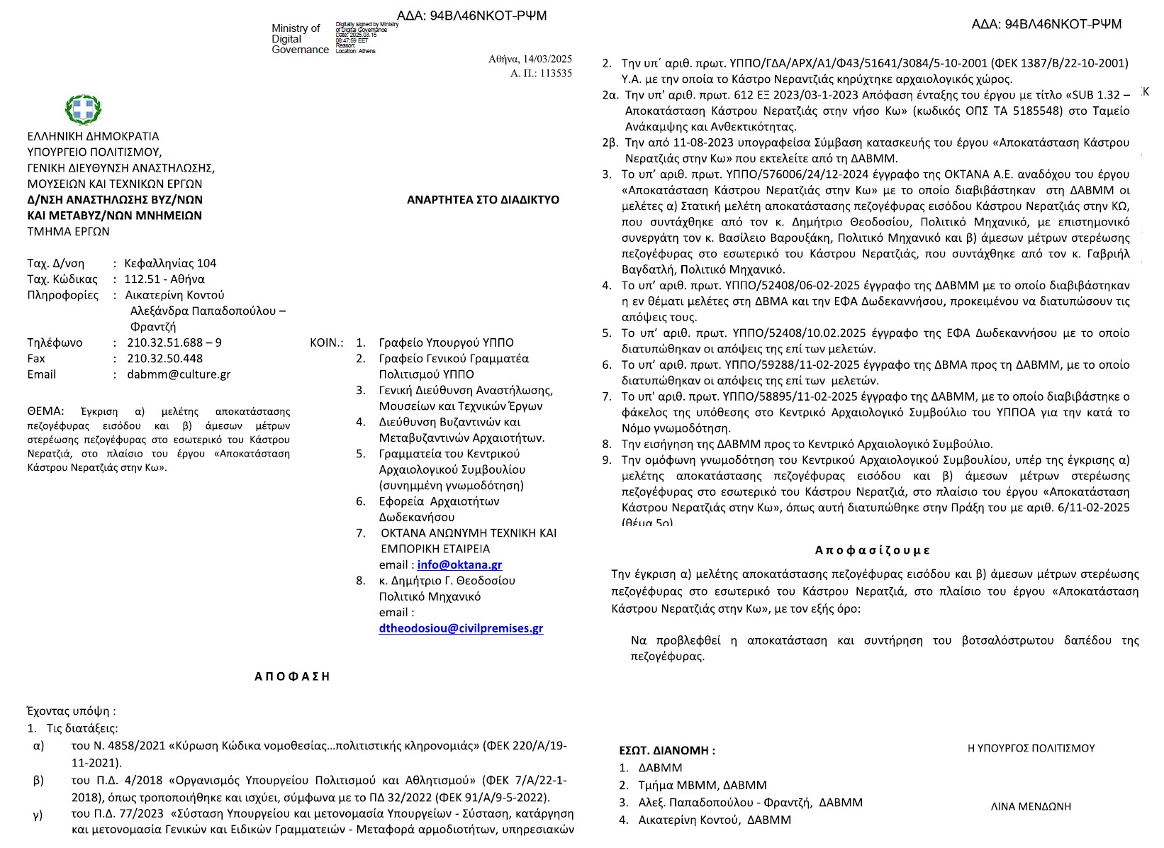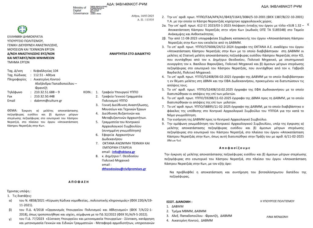 ΑΠΟΚΑΤΑΣΤΑΣΗ ΠΕΖΟΓΕΦΥΡΑΣ ΕΙΣΟΔΟΥ ΚΑΣΤΡΟΥ ΝΕΡΑΝΤΖΙΑΣ – ΚΩΣ