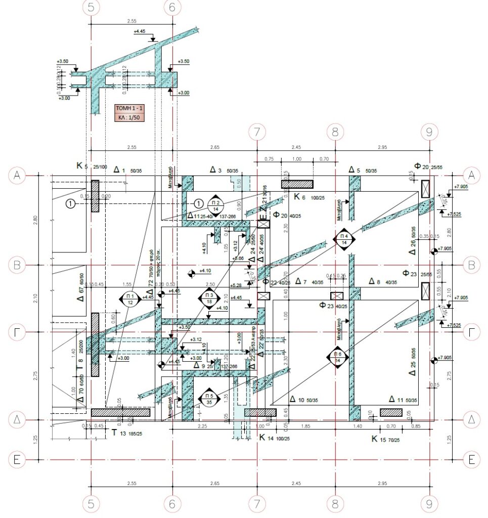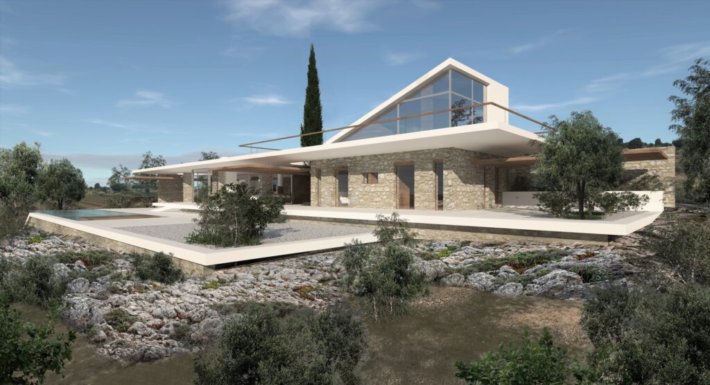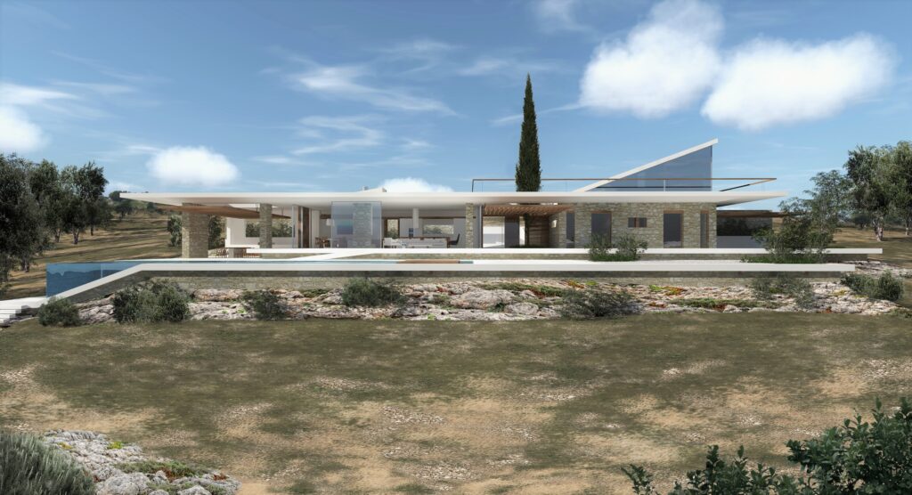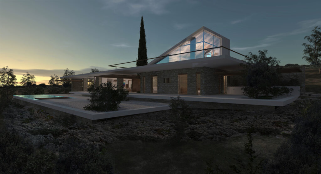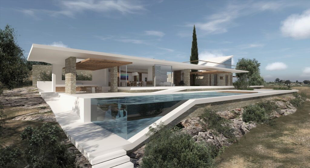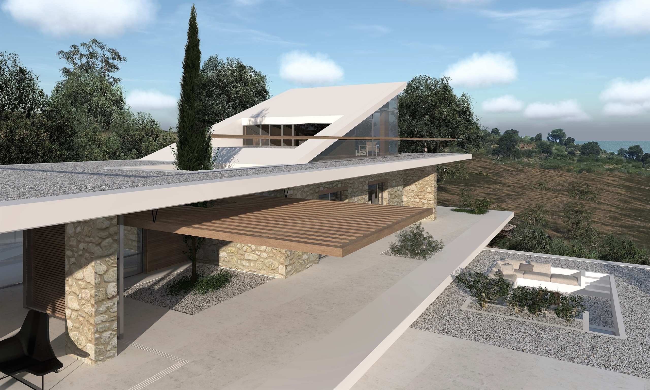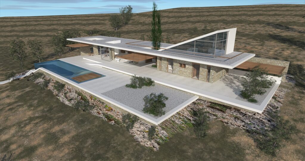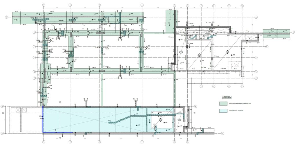 Πρόκειται για κατοικία με περιορισμένης εκτάσεως Υπόγειο, Ισόγειο και Α’ Οροφο. Περιλαμβάνει δεξαμενή κολύμβησης και μηχανοστάσιο. Η στέγη του Α’ Ορόφου είναι μονοκλινής πλάκα και «εξέρχεται» για αρχιτεκτονικούς λόγους από την οροφή Ισογείου. Ο Φέρων Οργανισμός του συνόλου του έργου θα κατασκευαστεί από Οπλισμένο Σκυρόδεμα. Στην οροφή Ισογείου για αρχιτεκτονικούς λόγους (φύτευση), συγκεκριμένες πλάκες έχουν προβλεφθεί να κατασκευαστούν διπλές. Στην μελέτη, κατά περίπτωση, έχει προσδιοριστεί ποιες από τις δύο πλάκες θεωρούνται κύριες (π.χ. επ’ αυτών που πακτώνονται εν συνεχεία οι μονές περιμετρικές πλάκες – πρόβολοι) και ποιες δευτερεύουσες (π.χ. στην περίπτωση όπου απαιτηθεί οι άνω πλάκες να είναι κύριες, τότε προβλέπονται και κάτω ελαφρές, μικρού πάχους δευτερεύουσες πλάκες, για λόγους κάλυψης της οροφής και μόνον, λύση που προτιμάται έναντι των τσιμεντοσανίδων