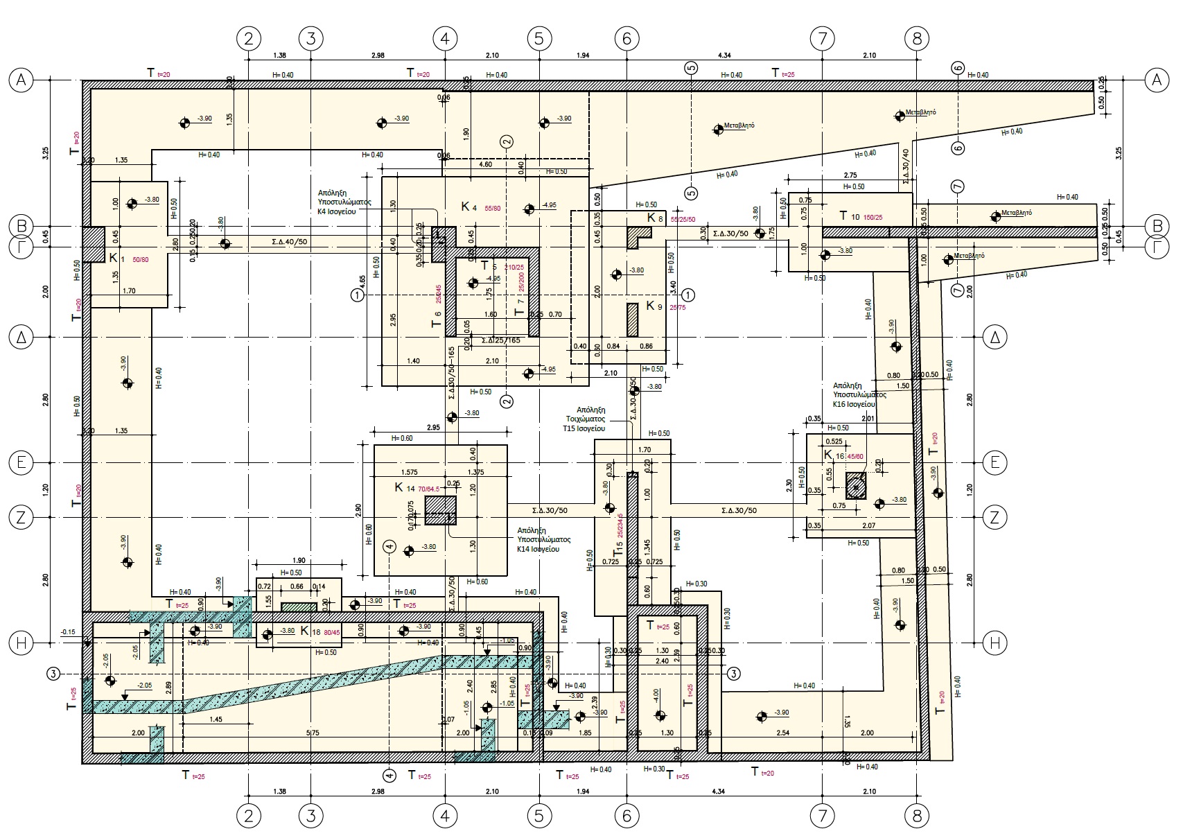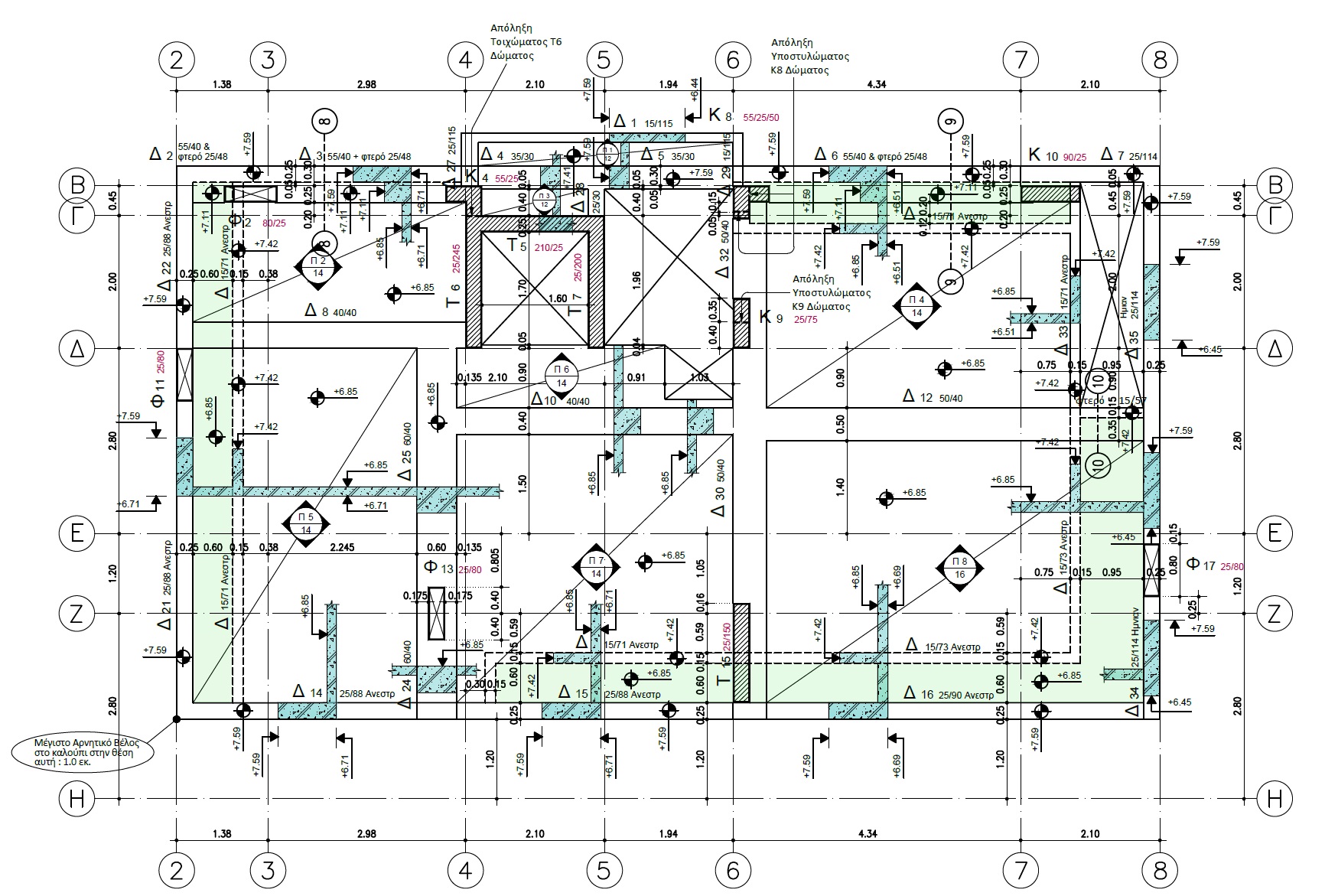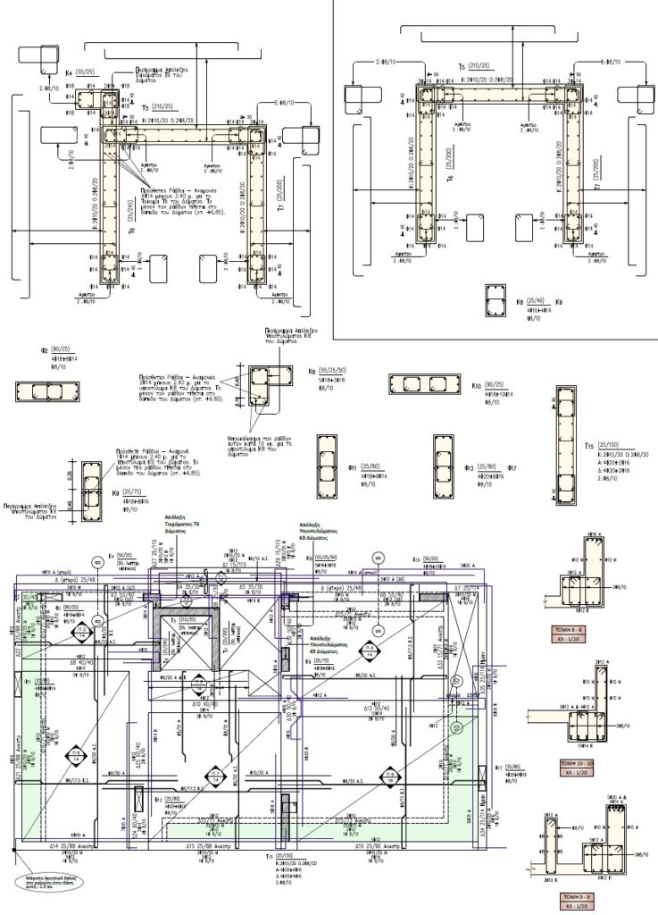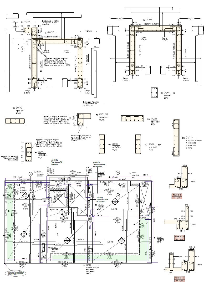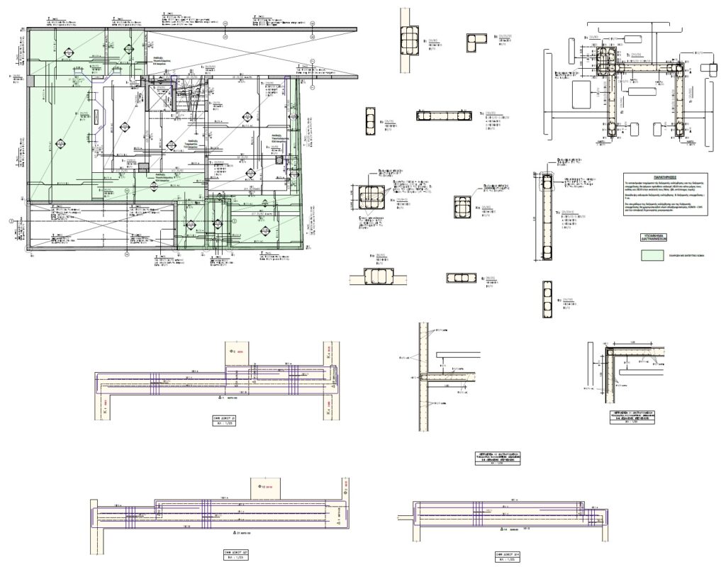 Η μελέτη αφορά κτίριο μονοκατοικίας, αποτελούμενο από Ισόγειο, Α΄ Οροφο και Υπόγειο. Ο Φέρων Οργανισμός του κτιρίου είναι από οπλισμένο σκυρόδεμα. Αξιοσημείωτο είναι ότι σε συγκεκριμένες θέσεις στην μπροστινή και στις πλαϊνές πλευρές του κτιρίου, τα υποστυλώματα διατάσσονται σε μεγάλη υποχώρηση από την περίμετρο, οπότε και δημιουργούνται δοκοί – πρόβολοι μεγάλου μήκους (έως 5.0 μ. απόσταση περιμέτρου κτιρίου από πλησιέστερο υποστύλωμα), για τις οποίες η μελέτη προβλέπει αρνητικό βέλος κατά την κατασκευή