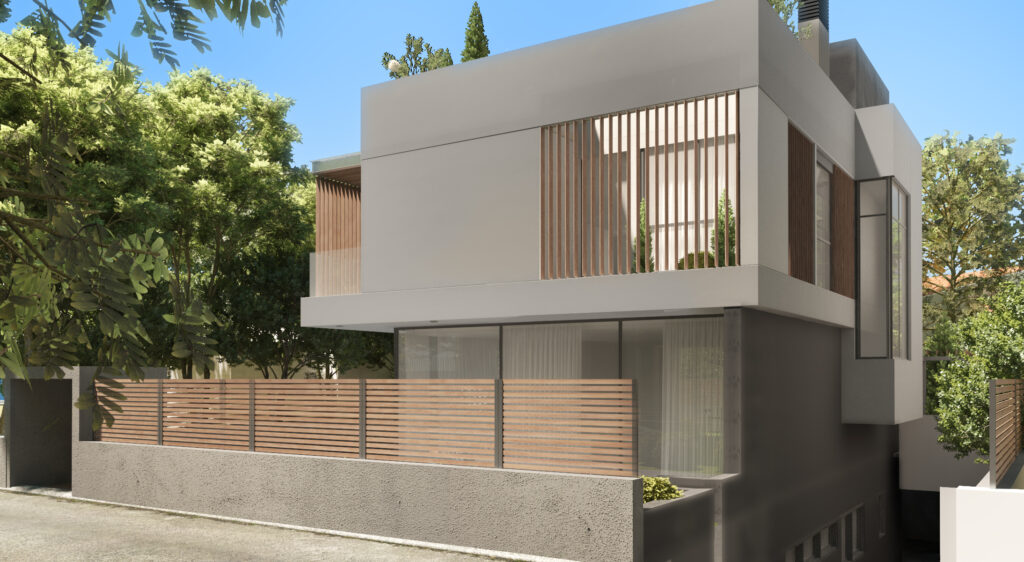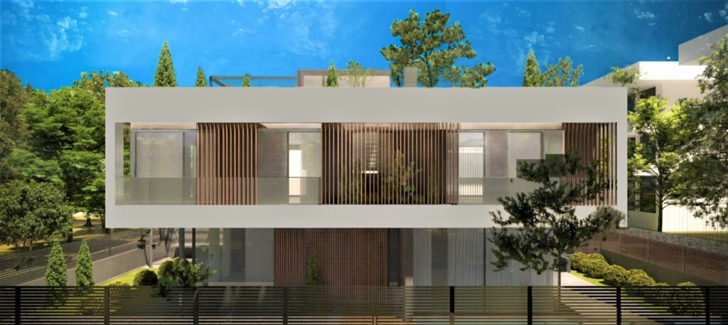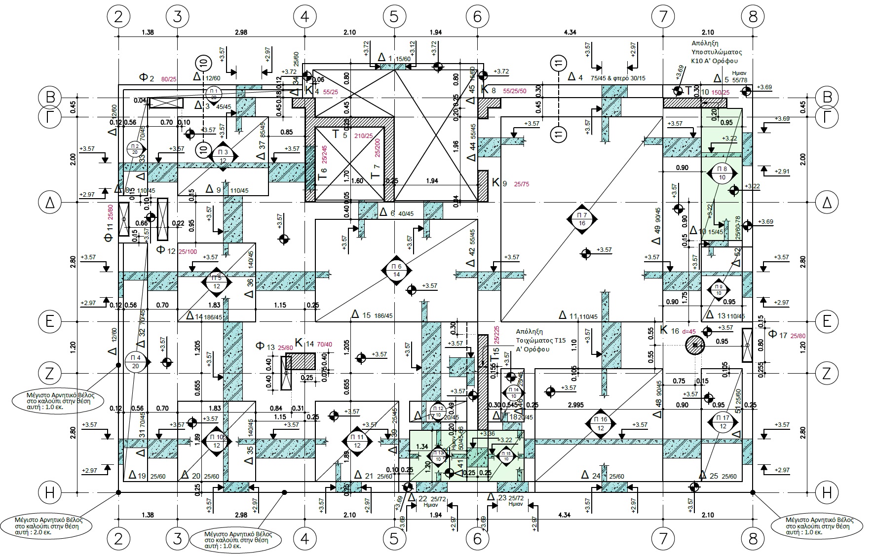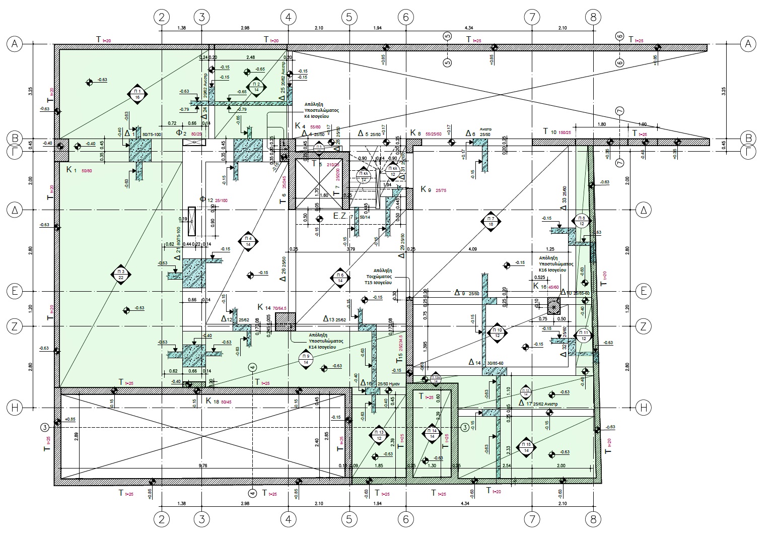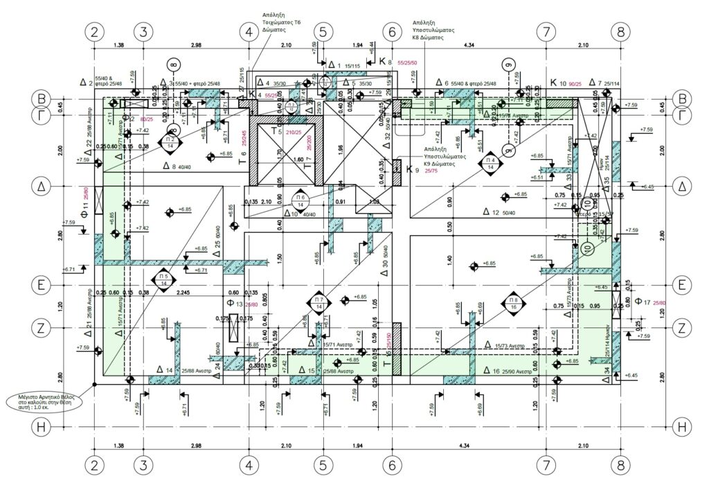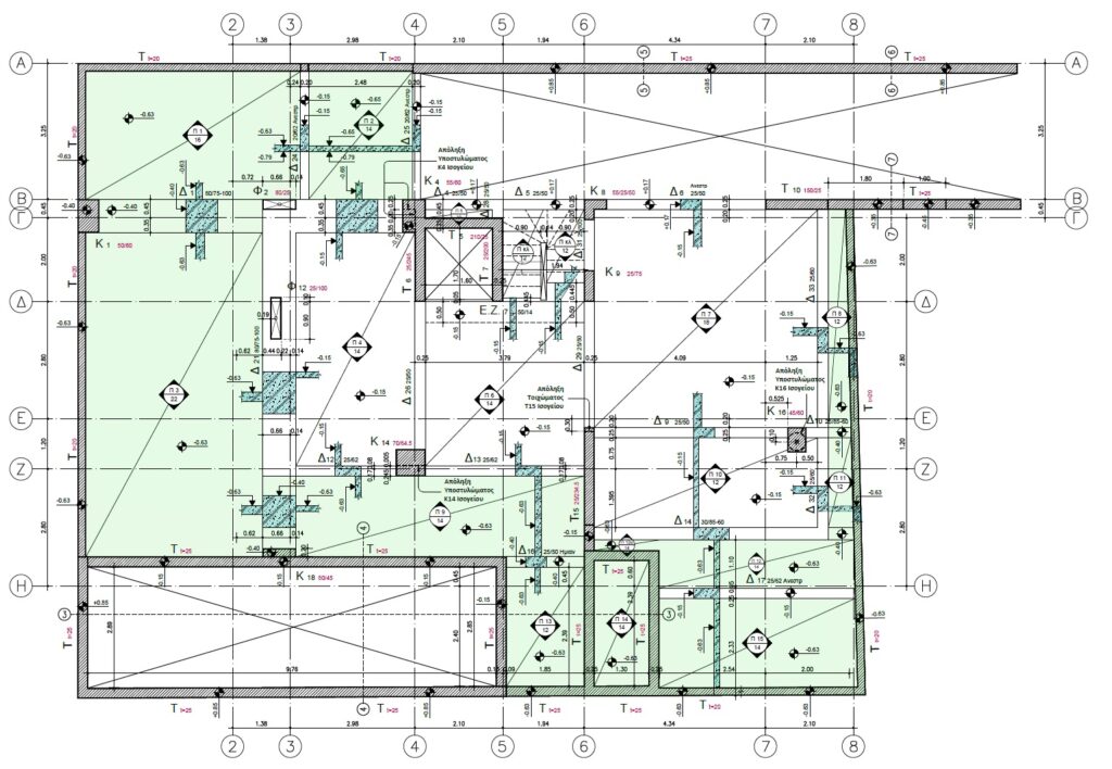 Η μελέτη αφορά κτίριο μονοκατοικίας, αποτελούμενο από Ισόγειο, Α΄ Οροφο και Υπόγειο. Ο Φέρων Οργανισμός του κτιρίου είναι από οπλισμένο σκυρόδεμα. Αξιοσημείωτο είναι ότι σε συγκεκριμένες θέσεις στην μπροστινή και στις πλαϊνές πλευρές του κτιρίου, τα υποστυλώματα διατάσσονται σε μεγάλη υποχώρηση από την περίμετρο, οπότε και δημιουργούνται δοκοί – πρόβολοι μεγάλου μήκους (έως 5.0 μ. απόσταση περιμέτρου κτιρίου από πλησιέστερο υποστύλωμα), για τις οποίες η μελέτη προβλέπει αρνητικό βέλος κατά την κατασκευή