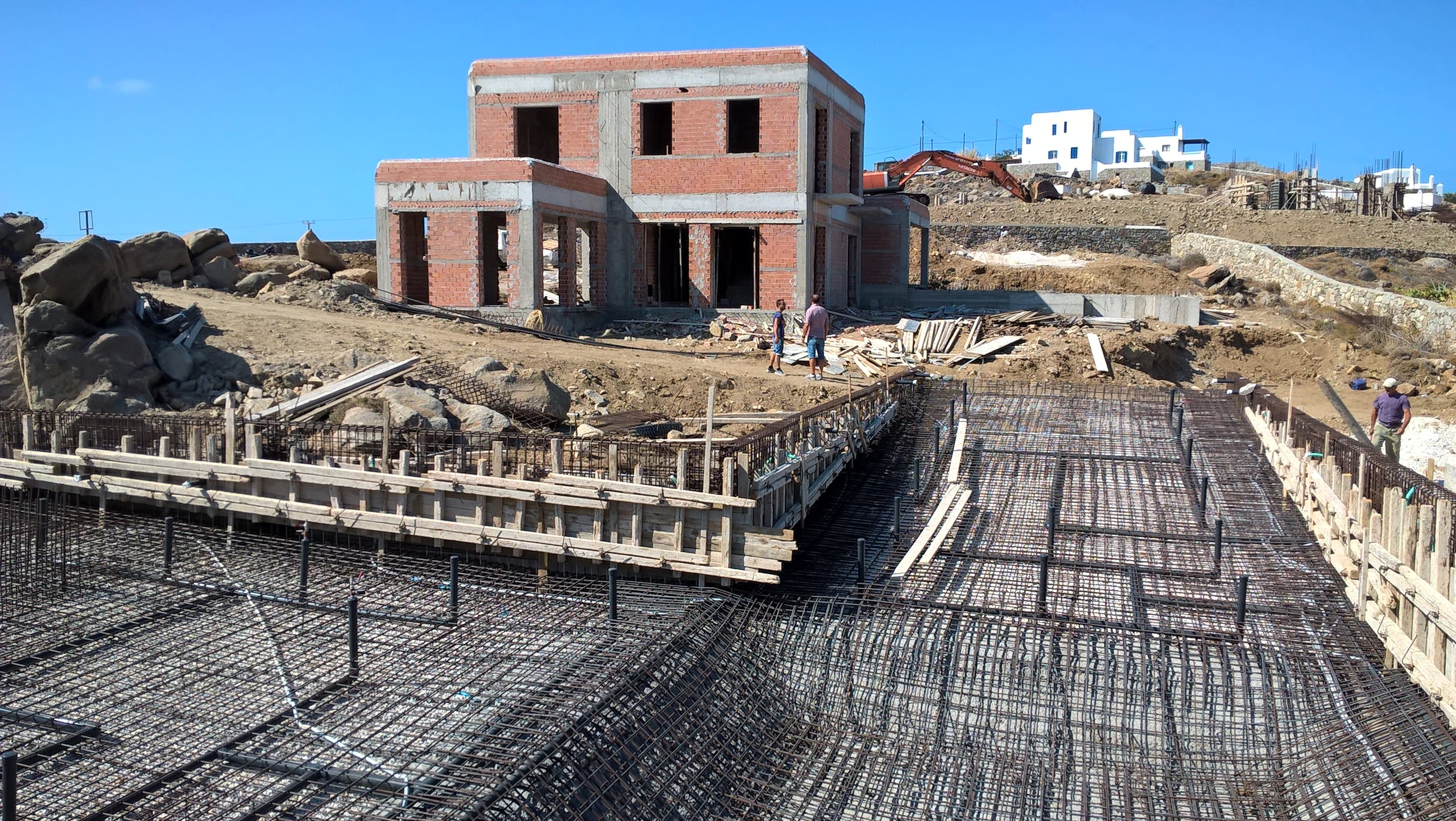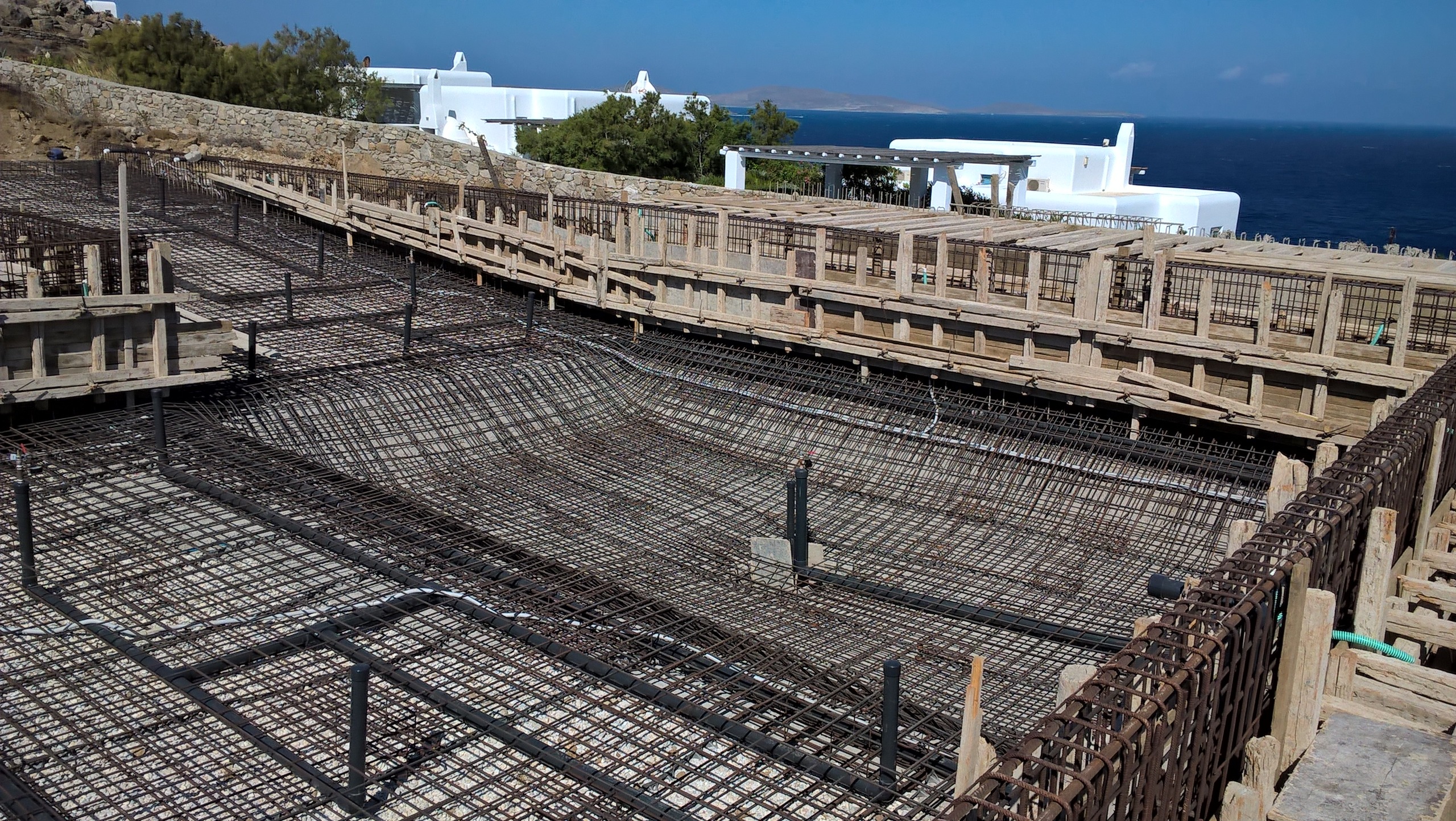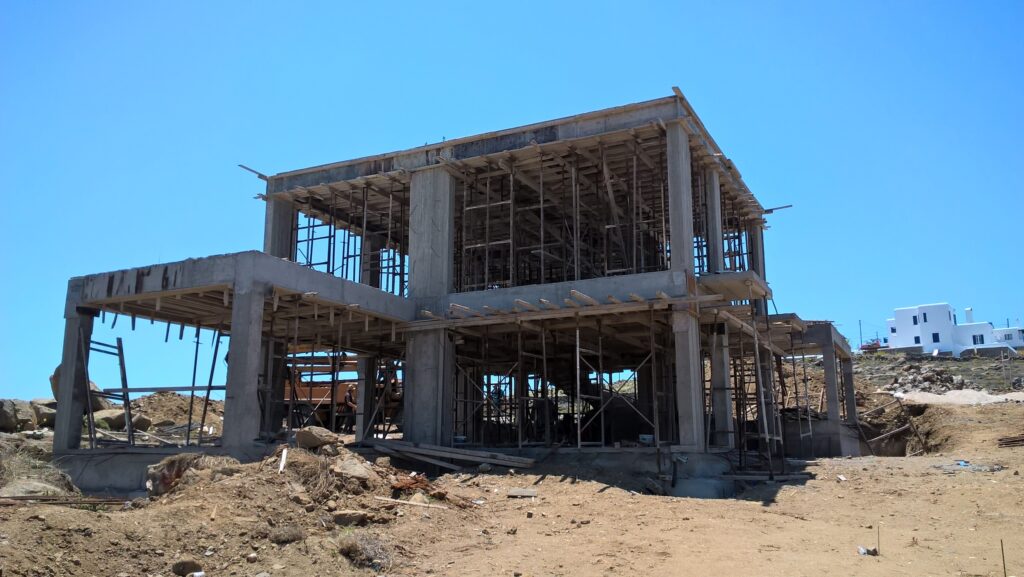Η μελέτη αφορά την ανέγερση α) νέας διόροφης εξοχικής κατοικίας με Ισόγειο και περιορισμένης κατόψεως Α’ όροφο (δεν υπάρχουν υπόγειοι χώροι) και β) συγκροτήματος κολυμβητικής δεξαμενής μετά δεξαμενής υπερχείλισης, δεξαμενής ύδατος, δεξαμενής ομβρίων και μηχανοστασίου. Η κατοικία με τα παρακολούθηματά της κατασκευάστηκε στην θέση “Αλεομάνδρα» της νήσου Μυκόνου. Ο Φέρων Οργανισμός της είναι από οπλισμένο σκυρόδεμα. Το συγκρότημα της κολυμβητικής δεξαμενής, της δεξαμενής υπερχείλισης, της δεξαμενής ύδατος, της δεξαμενής ομβρίων και του μηχανοστασίου, χωρίζεται απο το κυρίως κτίριο της οικίας και αποτελεί ενιαίο φορέα, στατικά ανεξάρτητο από αυτήν.