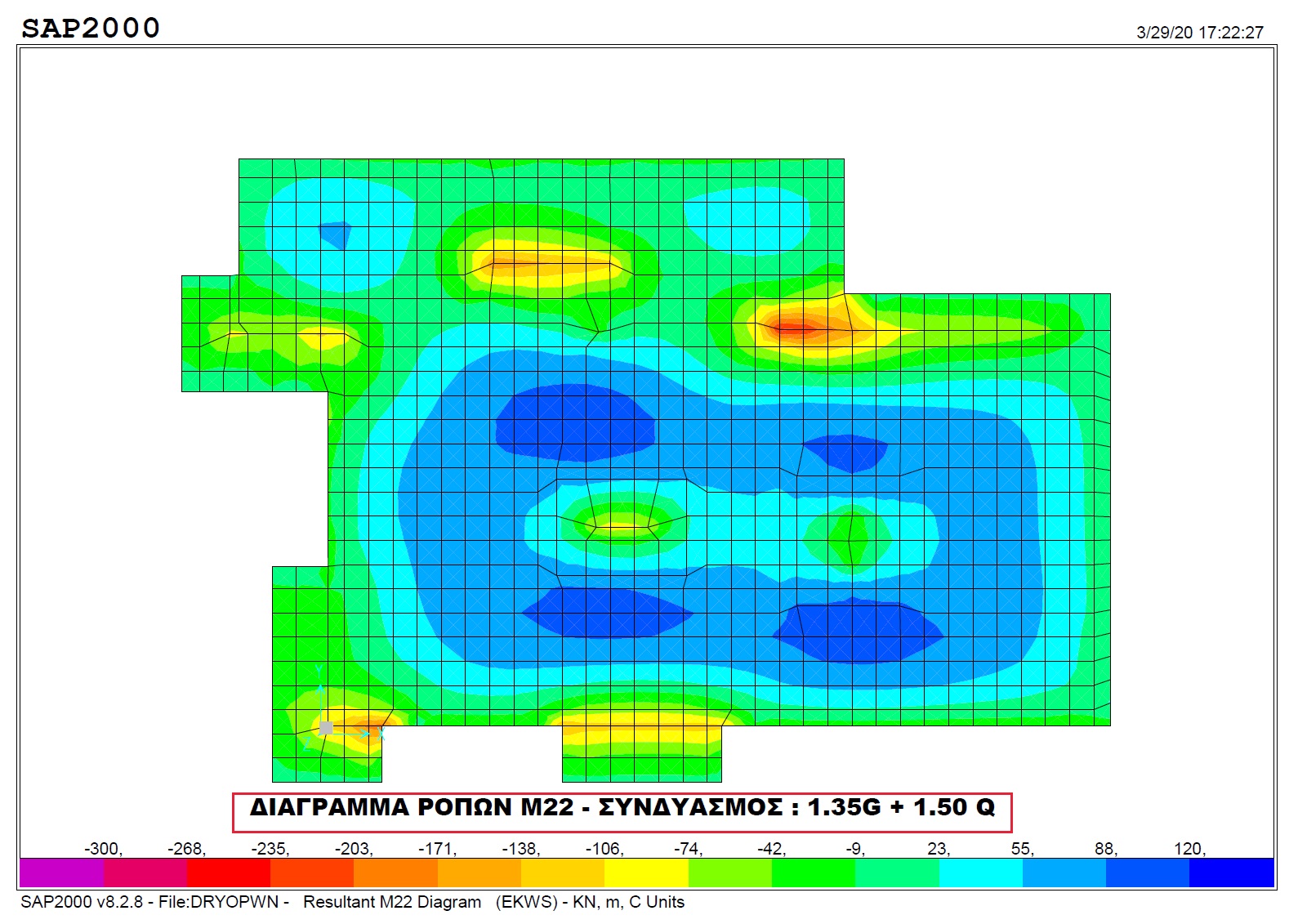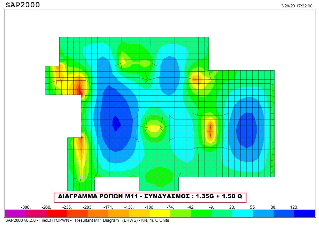 Για την μελέτη και διαστασιολόγηση της πλάκας γενικής κοιτόστρωσης, έγινε ιδιαίτερη πρόσθετη ανάλυση με μόρφωση της πλάκας αυτής από πεπερασμένα στοιχεία (finite elements), χρησιμοποιήθηκε δε το πρόγραμμα Η/Υ SAP2000. Η ενδοτικότητα του εδάφους ελήφθη υπόψη με εισαγωγή συγκεντρωμένων ελατηρίων ανά κόμβο, με σταθερά αυτή που αντιστοιχεί στο εμβαδόν επιρροής του κόμβου. Προκειμένου το μοντέλο να είναι ακόμη πιο ρεαλιστικό, επίσης με πεπερασμένα στοιχεία εδόθησαν και τα περιμετρικά τοιχώματα του υπογείου, ούτως ώστε να αναπαραστηθεί με ακόμη μεγαλύτερη ακρίβεια η διαφραγματική λειτουργία των τοιχωμάτων αυτών εντός του κατακόρυφου επιπέδου τους καθώς και η μερική πάκτωση που επιβάλλουν στην πλάκα γενικής κοιτόστρωσης, όταν αυτή συστρέφεται λόγω της βύθισής της από τα φορτία των τοιχωμάτων αυτών.