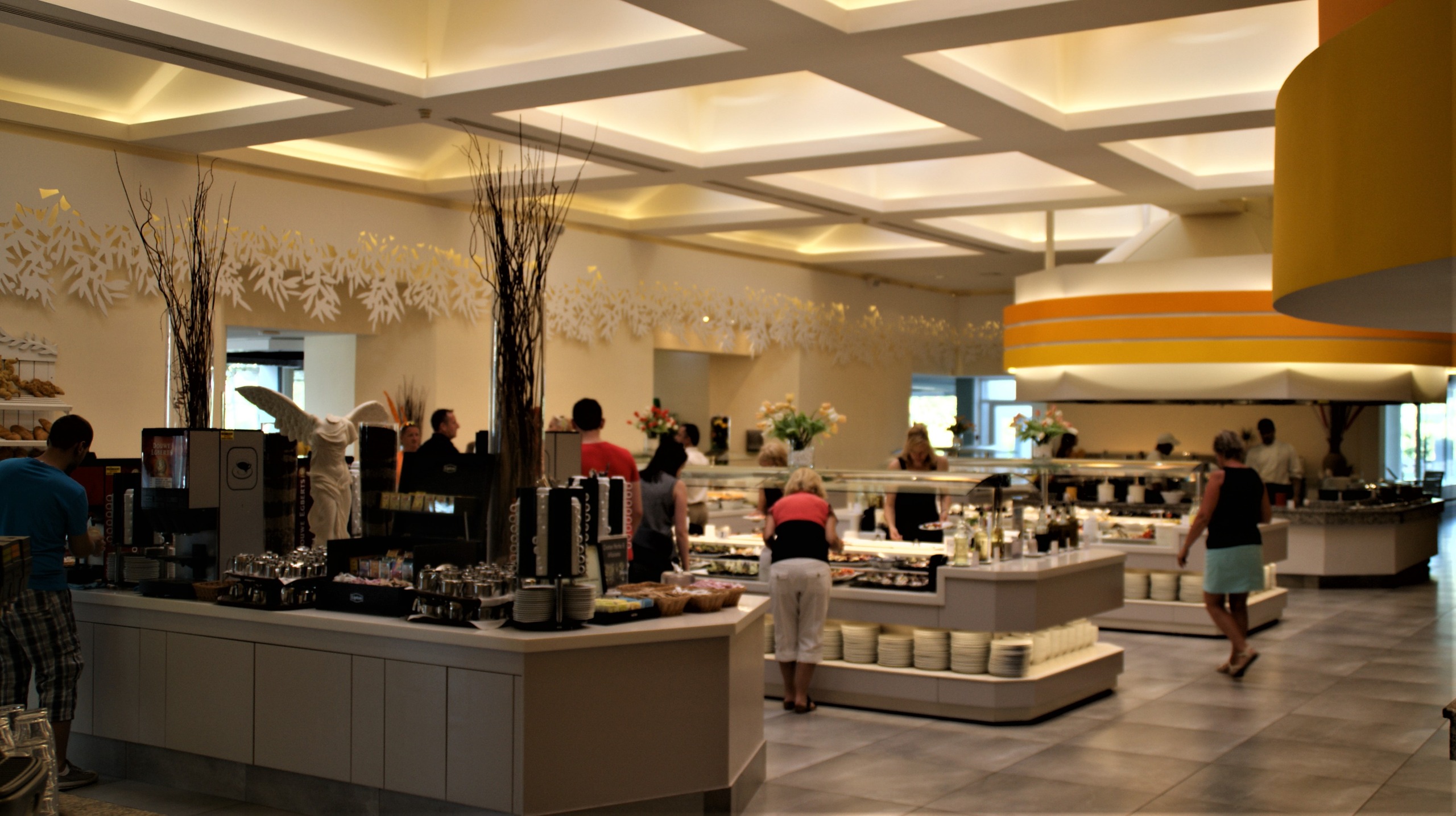 με τρεις – στατικά ανεξάρτητους μεταξύ τους – Ισόγειους πρόσθετους χώρους καθώς και με επίσης ανεξάρτητη Ισόγεια αίθουσα (μεγάλου ύψους) για τις ανάγκες σερβιρίσματος των διαμενόντων. Το χαρακτηριστικό των τριών χώρων εστιάσεως είναι η κατασκευή πολλών πυραμειδοειδών απολήξεων στις πλάκες οροφής του Ισογείου, όπου από κάτω διατάσσονται τα τραπέζια εστιάσεως και η εσωτερική (από την κάτω πλευρά των πυραμίδων) διακόσμηση παραπέμπει σε ομπρέλλα (βλ. σχετικές φωτογραφίες). Ο Φέρων Οργανισμός όλων των κτιριακών επεκτάσεων του εστιατορίου, περιλαμβανομένων και των πλακών με τις πυραμίδες, είναι από οπλισμένο σκυρόδεμα.