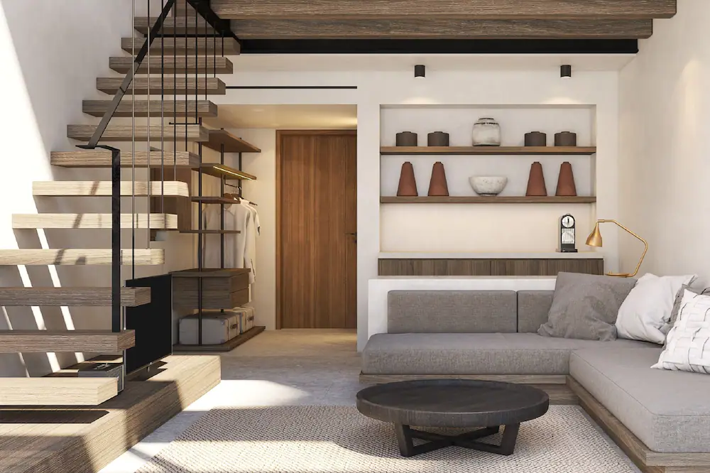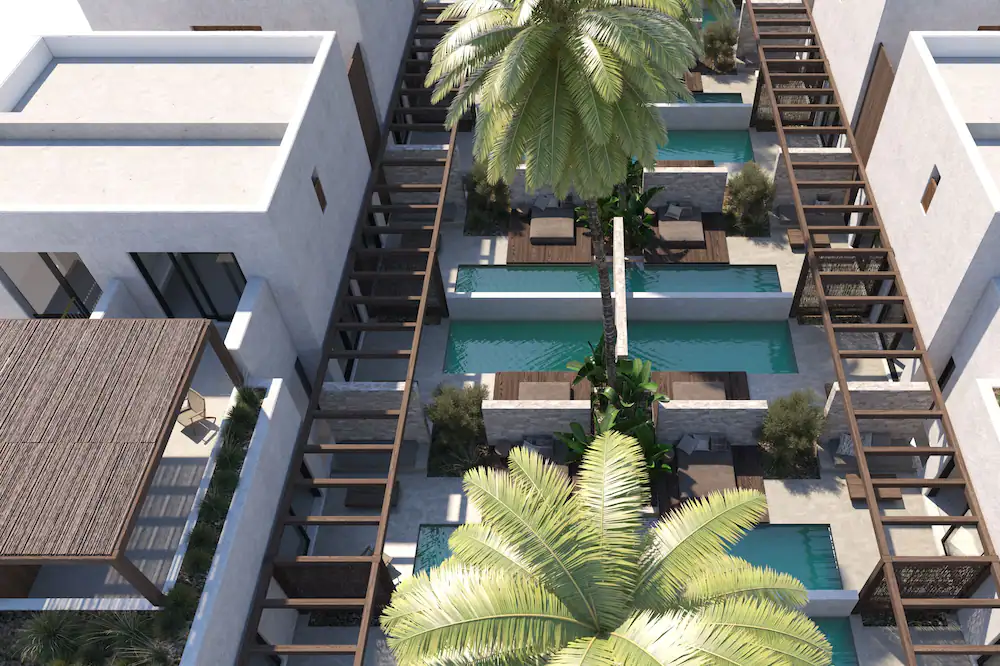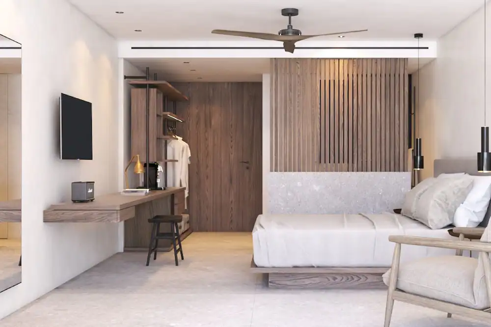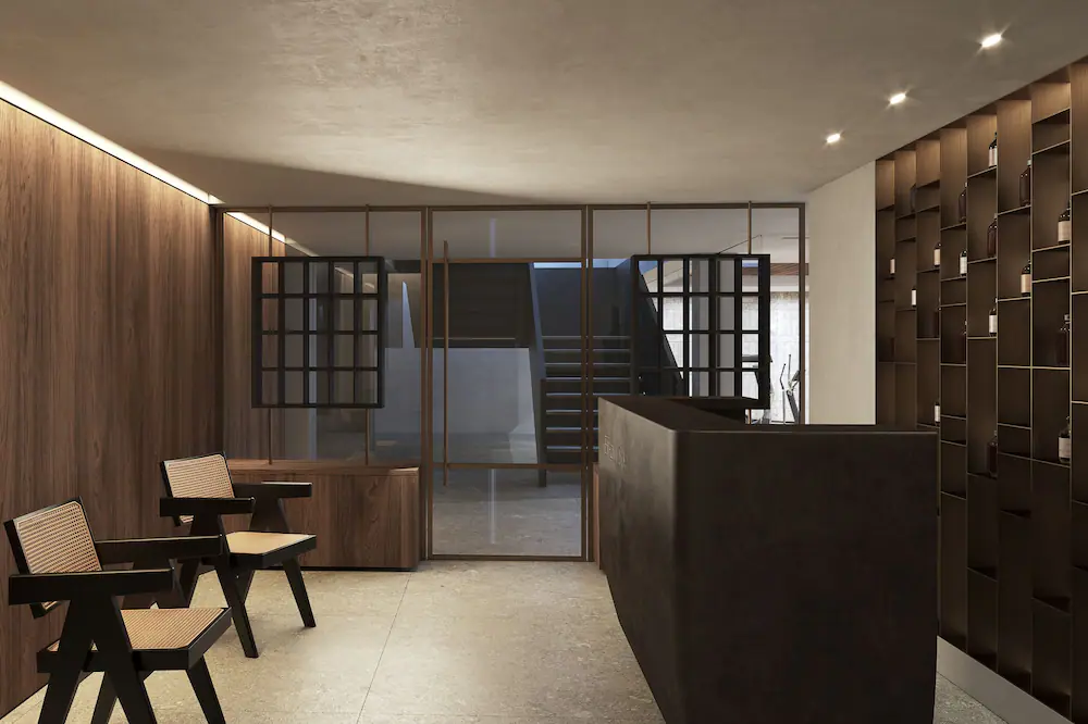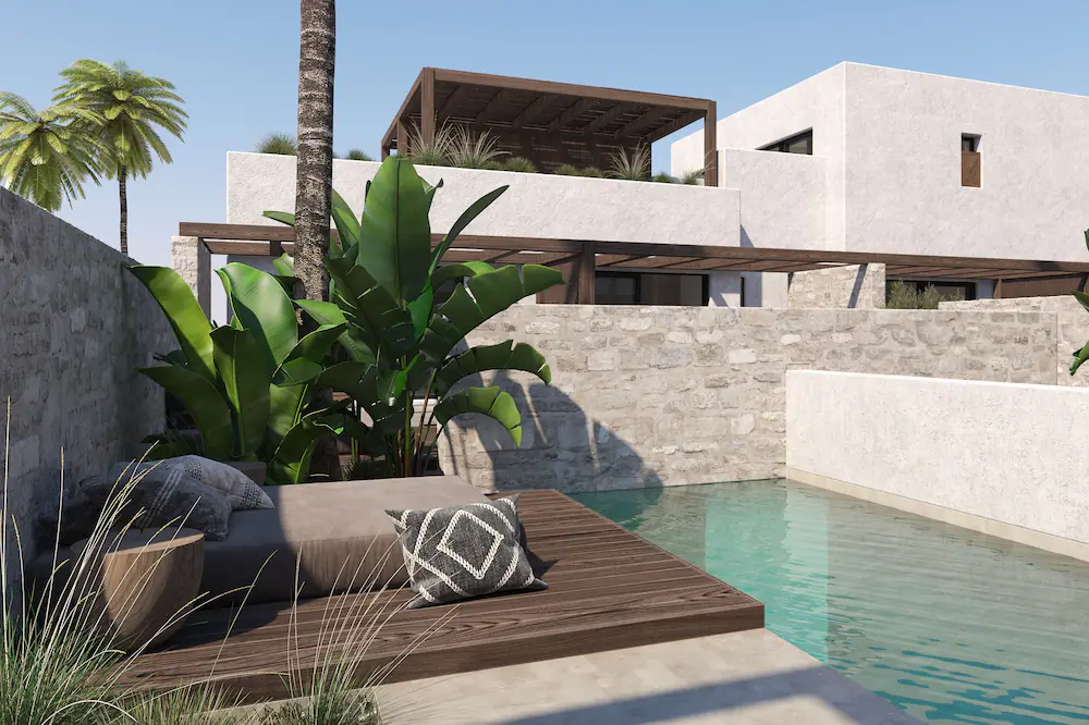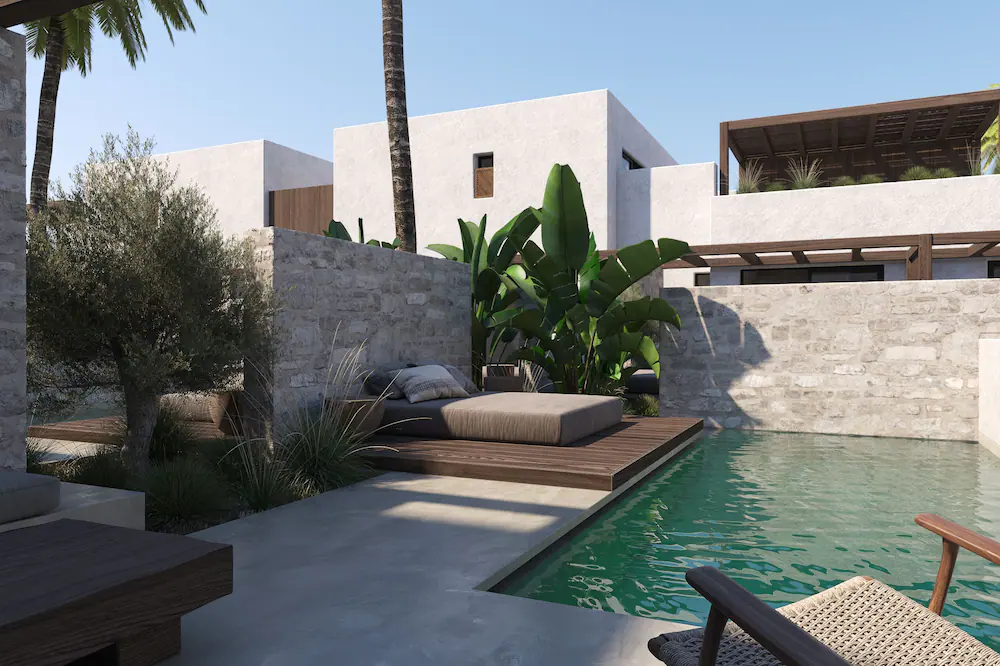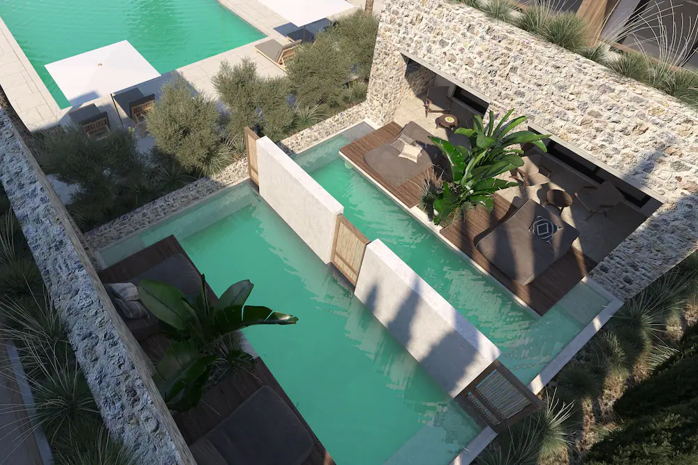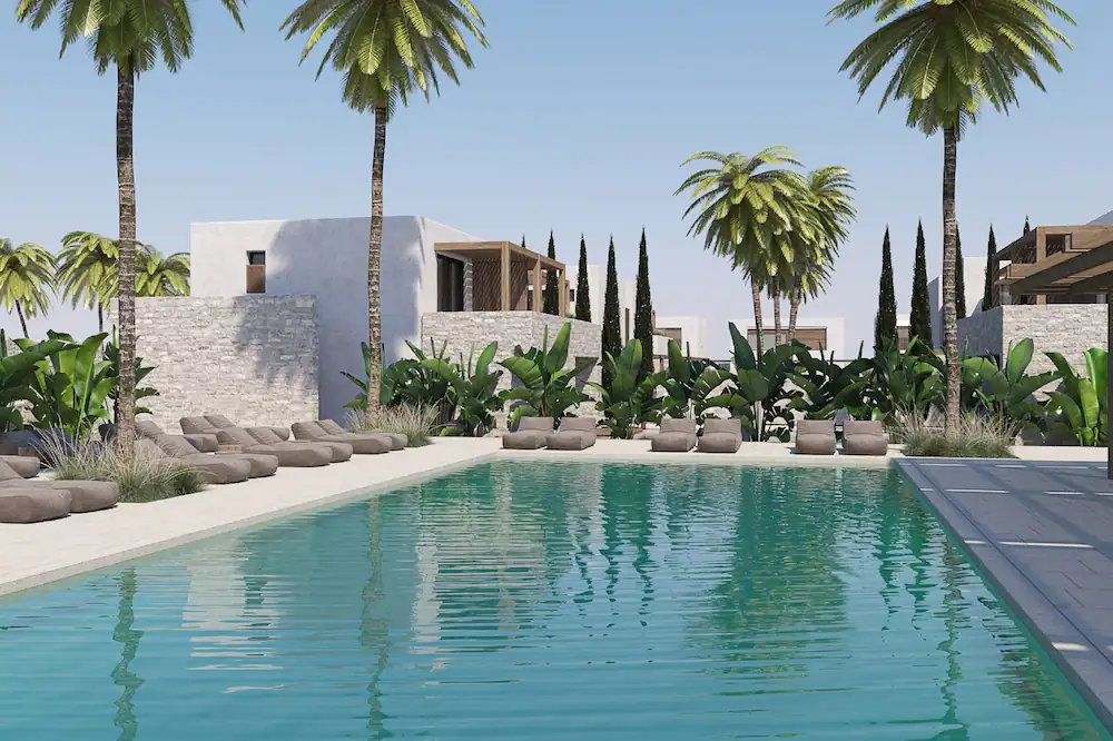 Πρόκειται για ένα συγκρότημα με ήπιο αποτύπωμα, εμπνευσμένο από την τοπική παραδοσιακή αρχιτεκτονική και ενταγμένο διακριτικά. To κεντρικό κτίριο είναι ένας ενιαίος χώρος με μεγάλα ανοίγματα στις μεγάλες πλευρές που από τη μια πλευρά βλέπει στην θάλασσα και από την άλλη στο εσωτερικό του συγκροτήματος. Τα δωμάτια αναπτύσσονται σε εσωστρεφή διάταξη και ο υπαίθριος χώρος τα συνδέει με κολυμβητικές δεξαμενές και πλούσια φύτευση από μεσογειακά είδη, ελιές, κυπαρίσσια και βότανα της περιοχής.