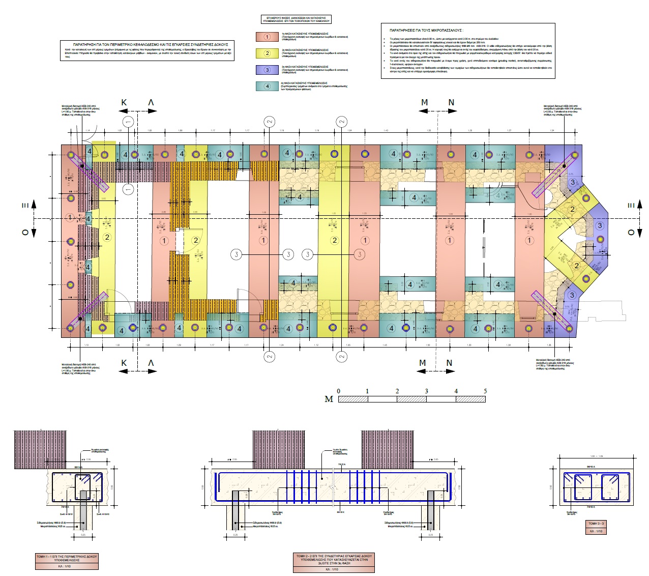 Οι ενισχύσεις γίνονται με καθολική εφαρμογή ενεμάτων, σφράγιση ρωγμών, λιθοσυρραφές, τοποθέτηση μεταλλικών ελκυστήρων, μεταφορά των φορτίων σε υγιέστερο έδαφος μέσω μικροπασσάλων κτλ.
